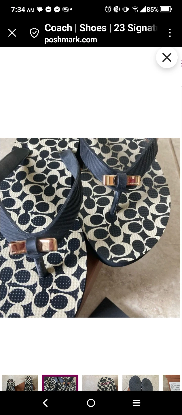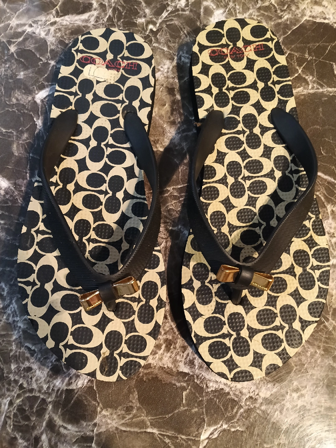 Brand new pair of Coach flip flops with the signature Coach pattern, They are black and beige size 5-6.