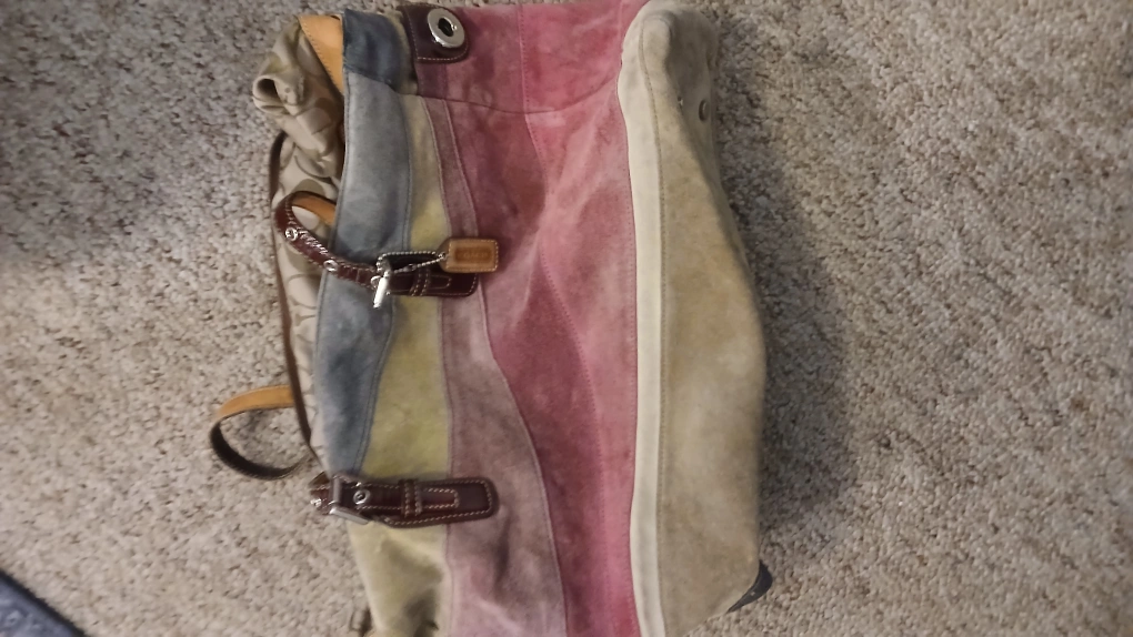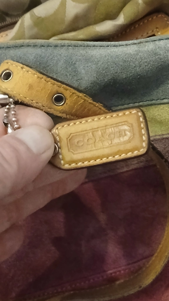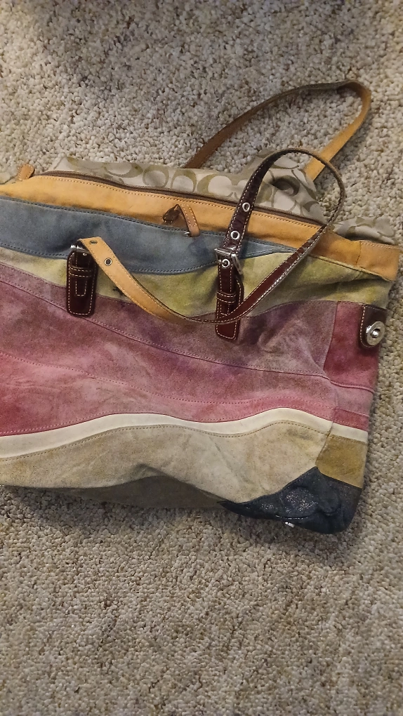 Selling a Coach tote bag with a unique suede patchwork design. The bag features various colors and has a zipper closure. It's a stylish and functional accessory for everyday use