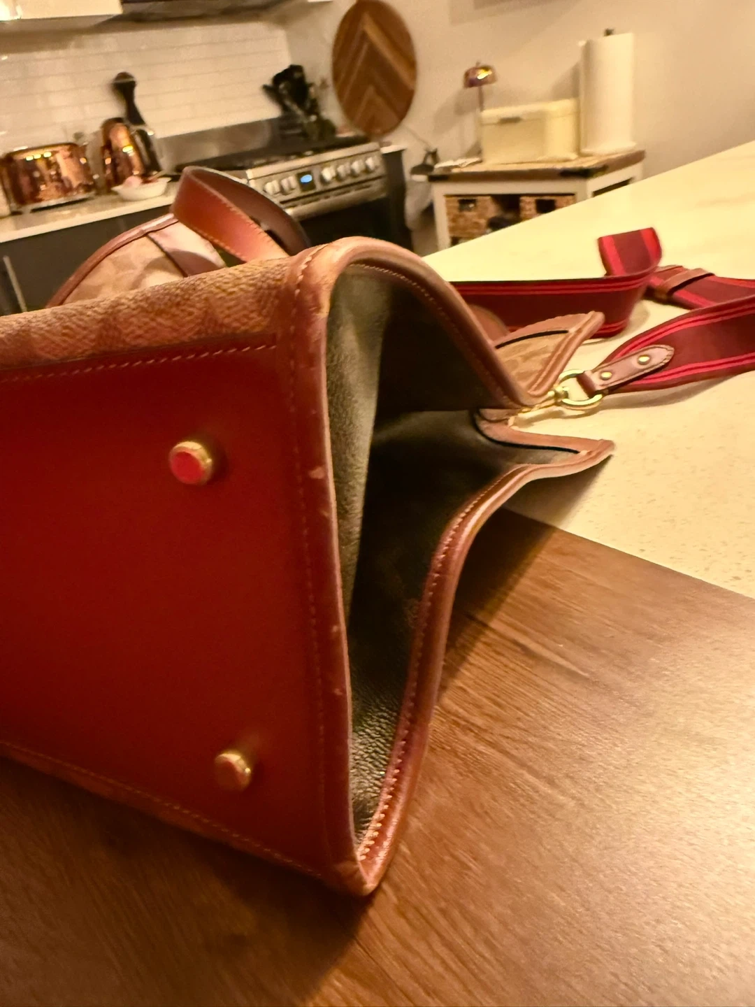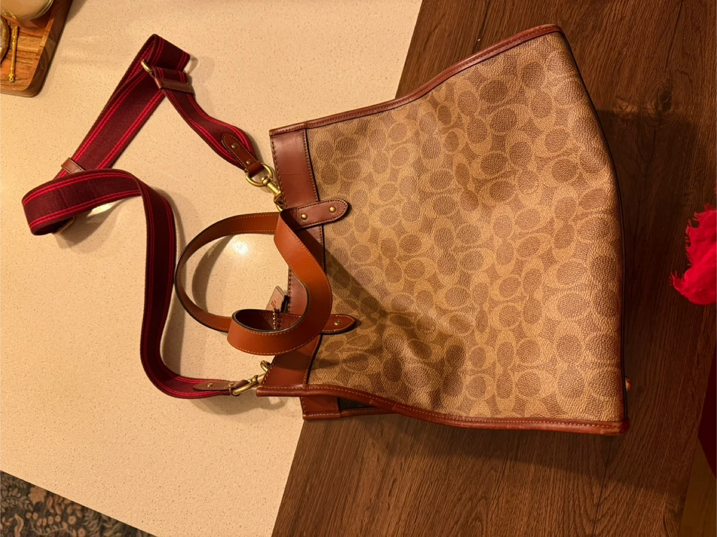 10Selling a Coach tote bag in brown. It shows some signs of wear, as seen in the photos. The bag features a distinctive Coach design and comes with both handles and a shoulder strap. The model number is H2161-C0775.