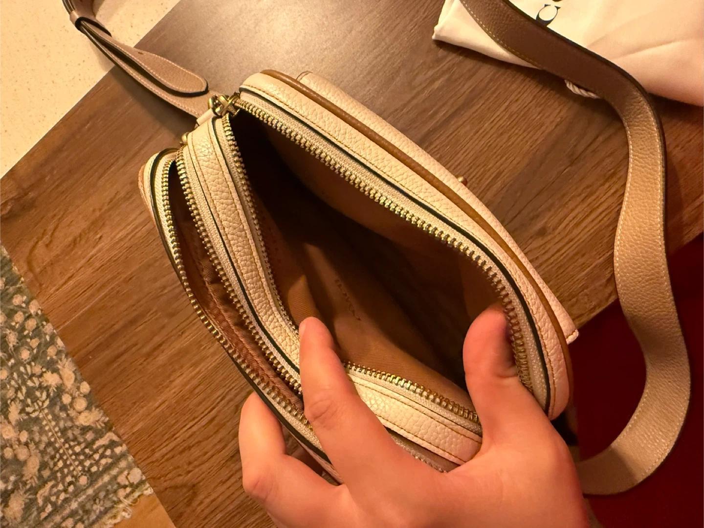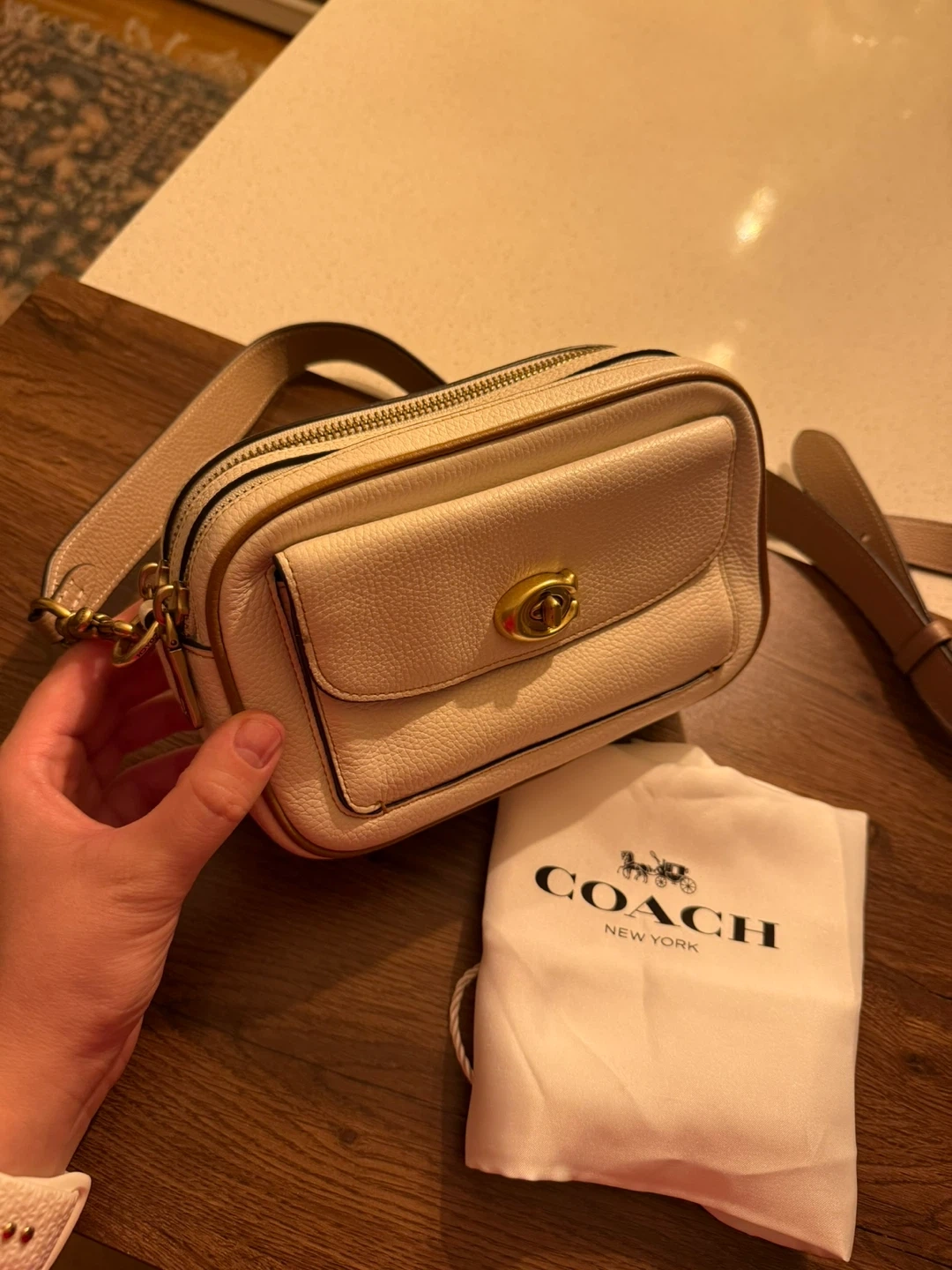 10Selling a cream-colored Coach crossbody bag. The bag has gold-colored hardware and a tan strap. It's in great condition and comes with its original dust bag!