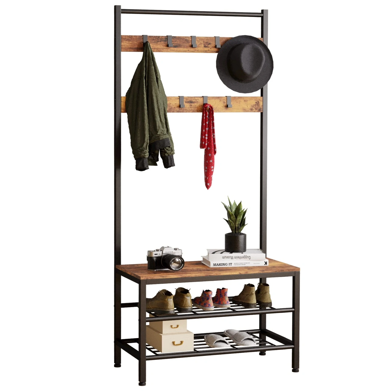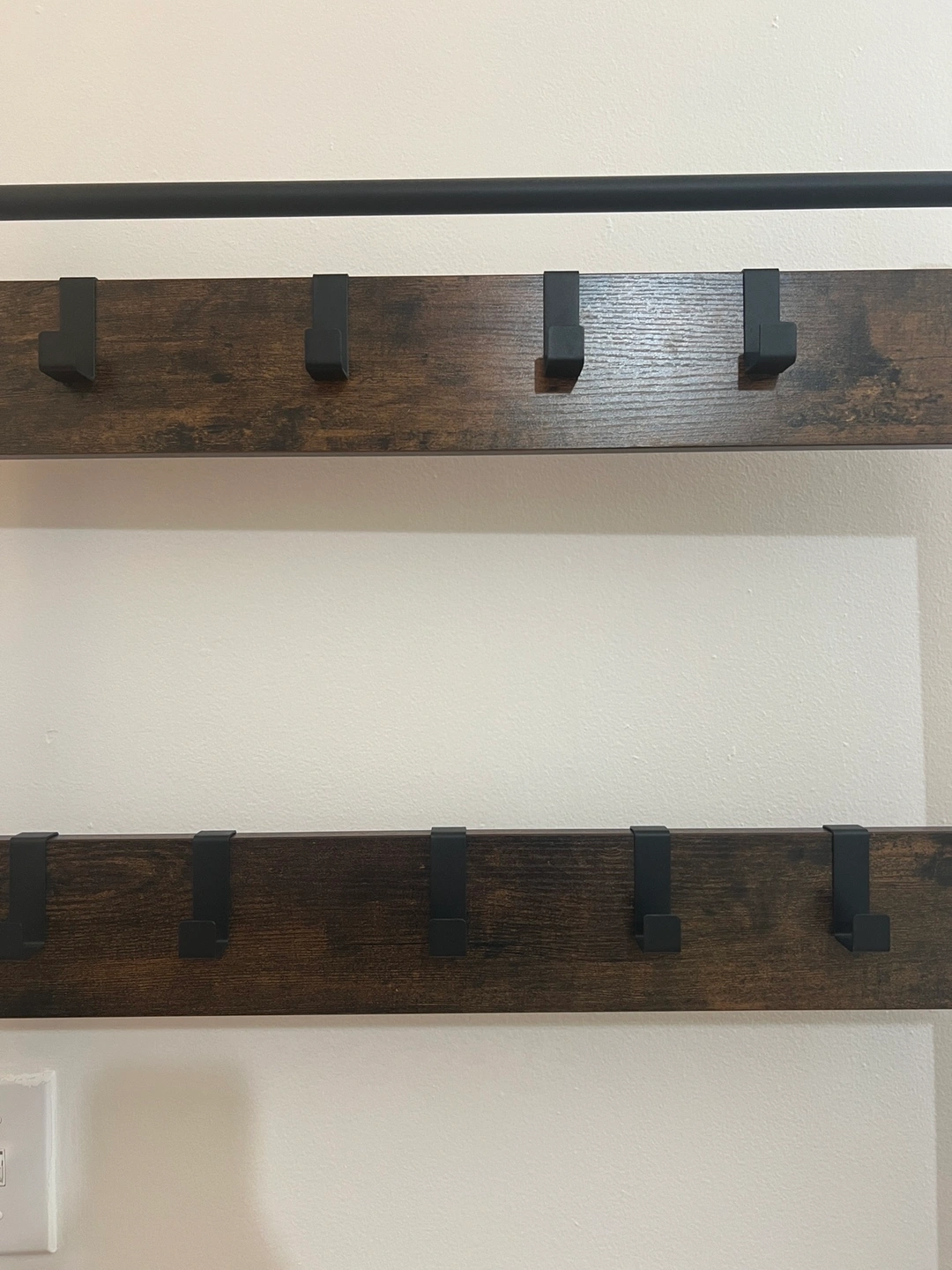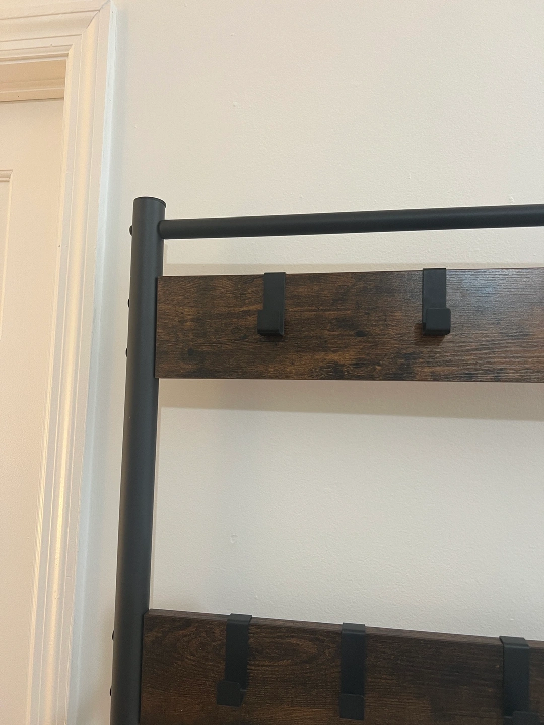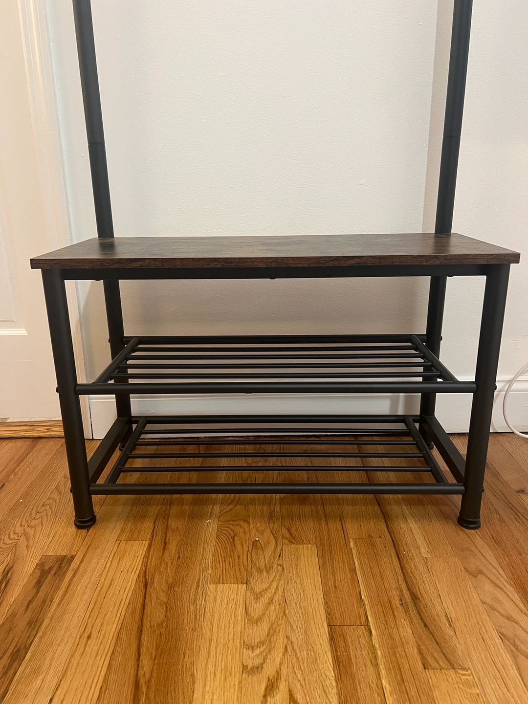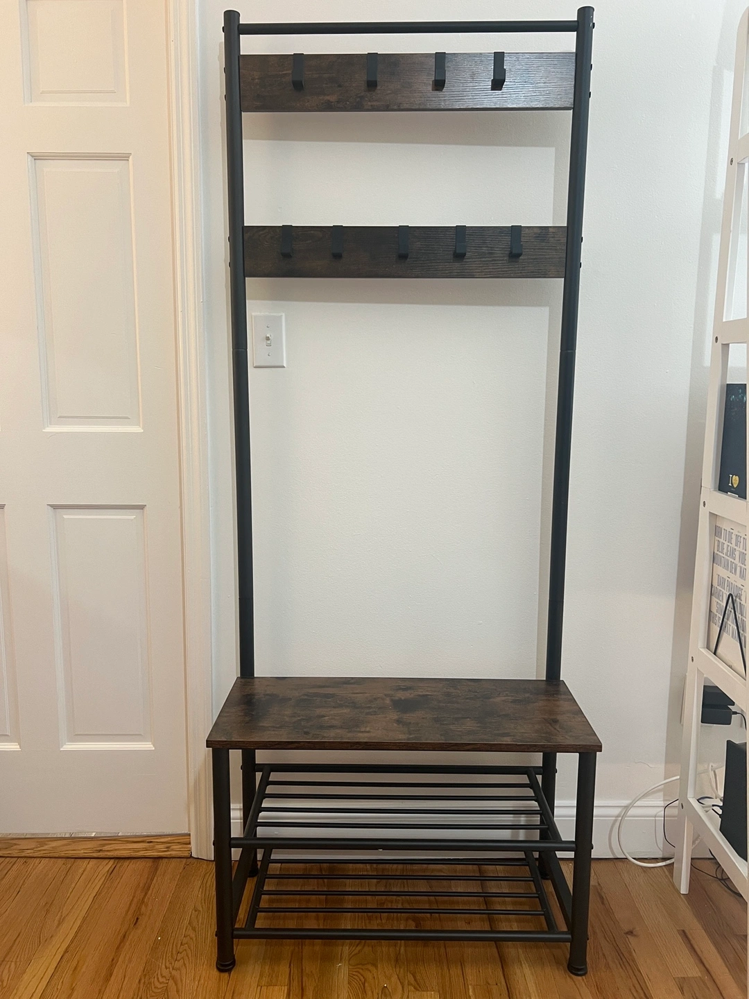 162Coat and shoe rack perfect for small entryway or hallway. It has 9 movable hooks for hats, coats, keys, dog leashes, etc. There are also 2 additional shoe storage shelves and 1 bench. It’s fairly light and easy to move but can also be disassembled at the middle to transport more easily. Originally bought for $50