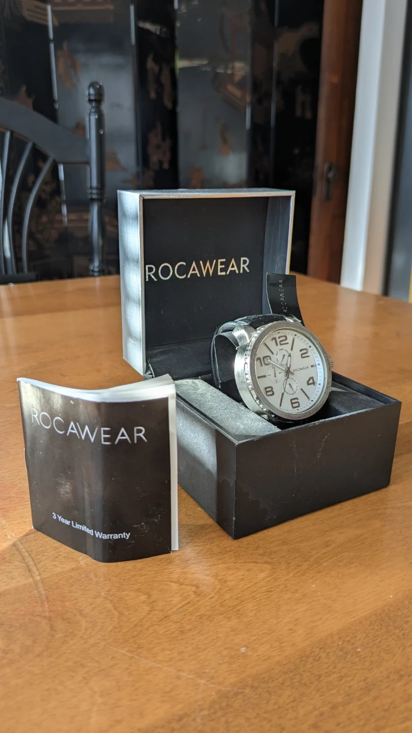 This is a Rocawear men's watch. It comes with the original box and a 3-year limited warranty manual. The watch has a white face with silver accents and a black band.