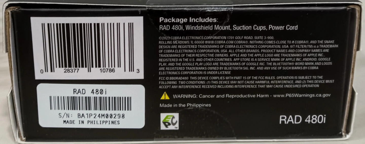 Cobra RAD 480i Connected Radar Detector, Long Range, Bluetooth, Front & Rear Detection + CarPlay Is Brand New. Product Details: *Front and Rear Detection – Cobra’s new LaserEye technology detects signals from both the front and rear of your vehicle, giving you all-around protection wherever your adventures take you. *Long Range Radar & Laser Detection – Next generation updateable IVT Filter and advanced anti-falsing circuitry intelligently reduces false alerts from blind spot systems and other vehicle avoidance systems. *2nd Generation False Alert Filtering - Enjoy a quiet ride with reduced false alerts from Blind Spot Monitoring and other radar-based systems. *Digital Signal Processing (DSP) - Built-in DSP enables faster processing for all incoming signals to provide rapid and accurate alerts. *Bluetooth Connectivity integrates your radar detector with our Cobra community App. App Integration includes live automatic community reports, locations of stop lights and speed traps, red light cameras, road hazards, and live police alerts. *Premium Anti-Falsing Circuitry And Updatable IVT Filter - Automatically Reduces False Alerts From Erroneous Sources In-Vehicle Technology Sources Such As Vehicle Collision Avoidance Systems And Adaptive Cruise Control. *Early Warnings – Digital Signal Processing provides faster processing for all incoming laser gun signals and rapidly provides accurate alerts, making you aware of a threat before it is right in front of you. *LaserEye Protection - LaserEye® detects laser signals from both the front and rear of your vehicle. *Apple CarPlay & Android Auto Compatible - Easily view your route and interact with alerts on your CarPlay or Android Auto compatible display. Increase your focus on the road ahead, and have control over your alerts without fumbling for your phone. *Device Settings Management - Easily adjust your features, alerts, and settings on any supported device. *Everything You Need Comes in the Box - The Cobra RAD 480i radar detector comes with a 12V vehicle power cord, suction cup car windshield mount, a hook and loop fastener for dash mounting, and a quick start guide. Everything you need for wherever the road takes you.