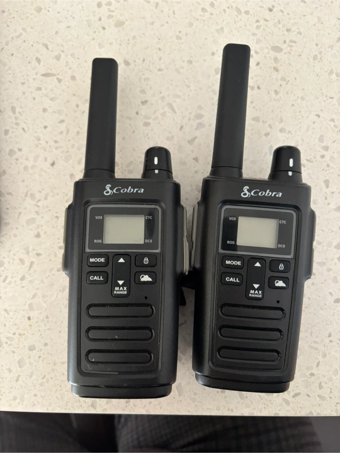 60Selling a pair of Cobra two-way radios. They are black and have features like VOX, CTC, DCS, ROG, and a max range function. Perfect for staying connected on outdoor adventures!