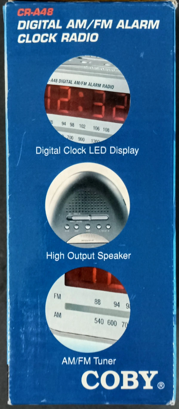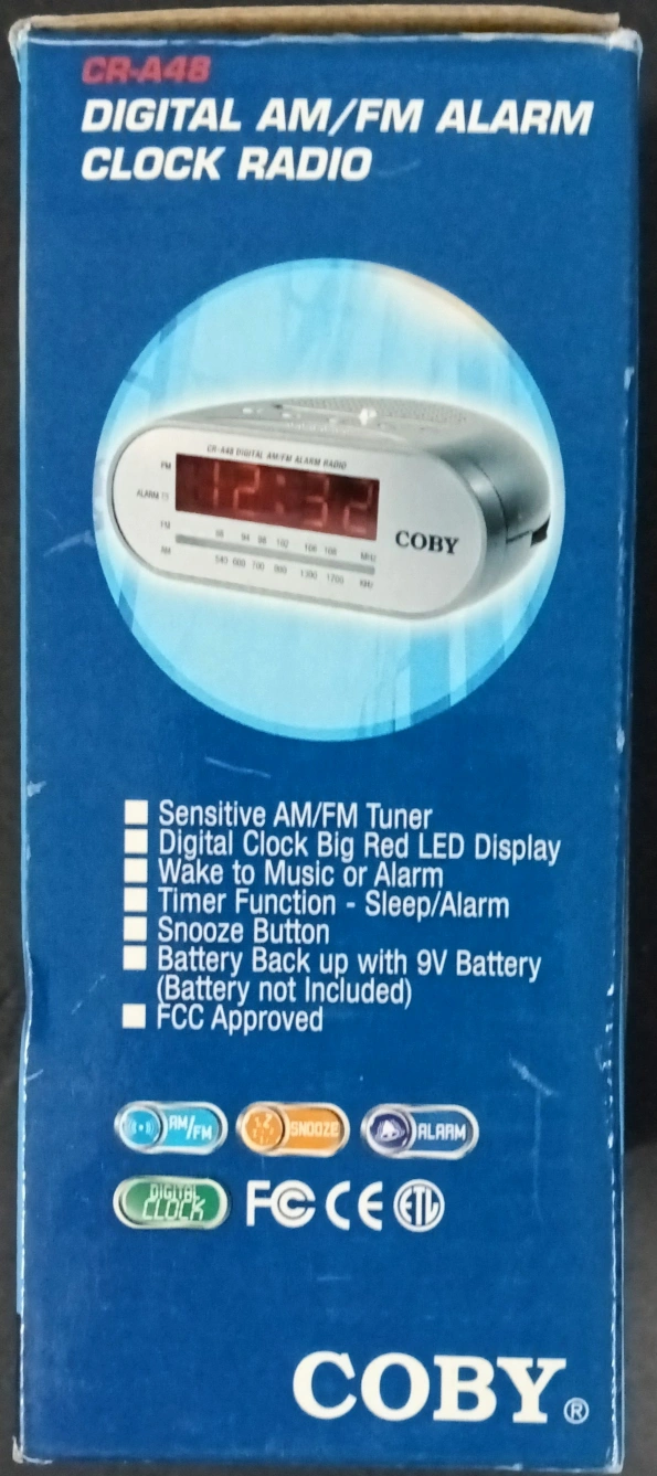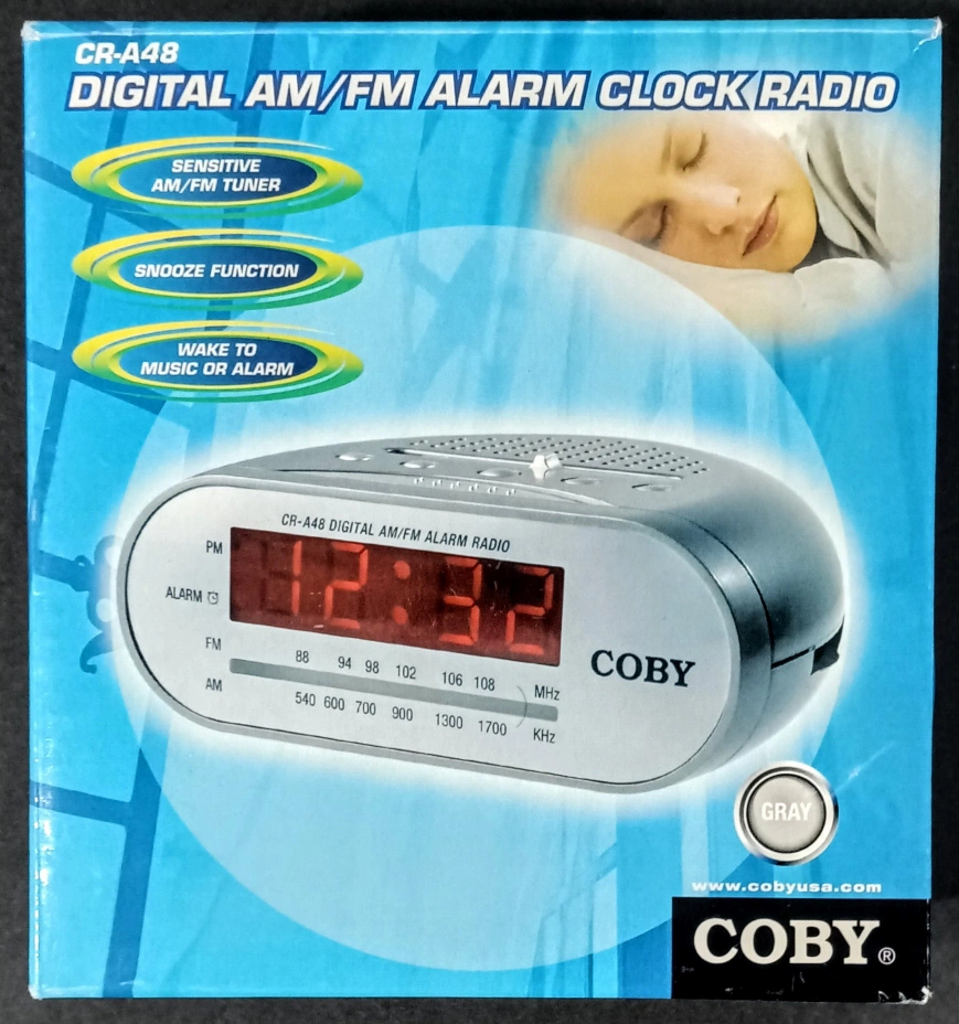 38Coby Electronics CR-A48 Digital AM/FM Alarm Clock Radio, Gray Is Brand New $10 Firm. *Sensitive AM/FM Tuner *Digital Clock Big Red LED Display *Wake to music or alarm/Snooze Button *Timer function - Sleep/Alarm *Battery back up with 9V battery