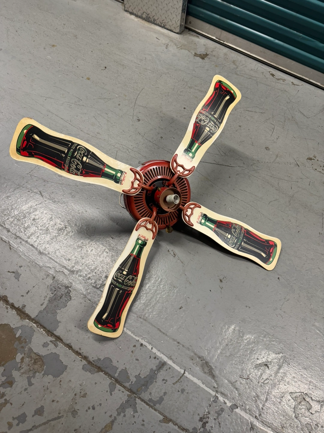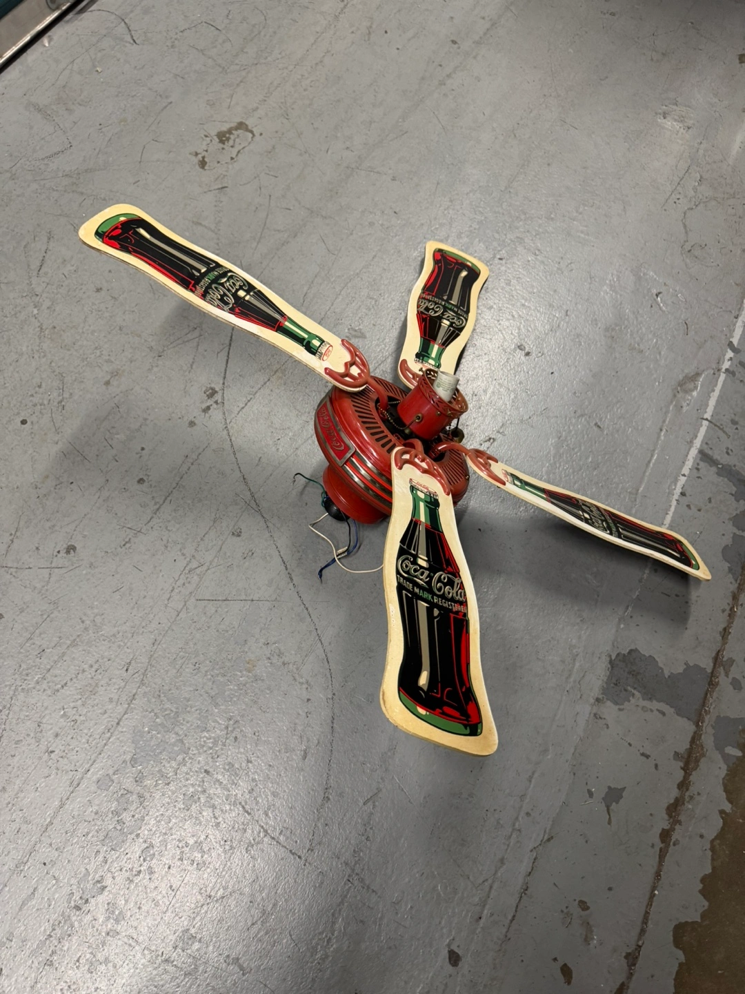Selling a unique Coca-Cola bottle ceiling fan! This fan features blades shaped like classic Coca-Cola bottles. It's a fun and eye-catching piece for any Coca-Cola enthusiast or vintage decor lover
