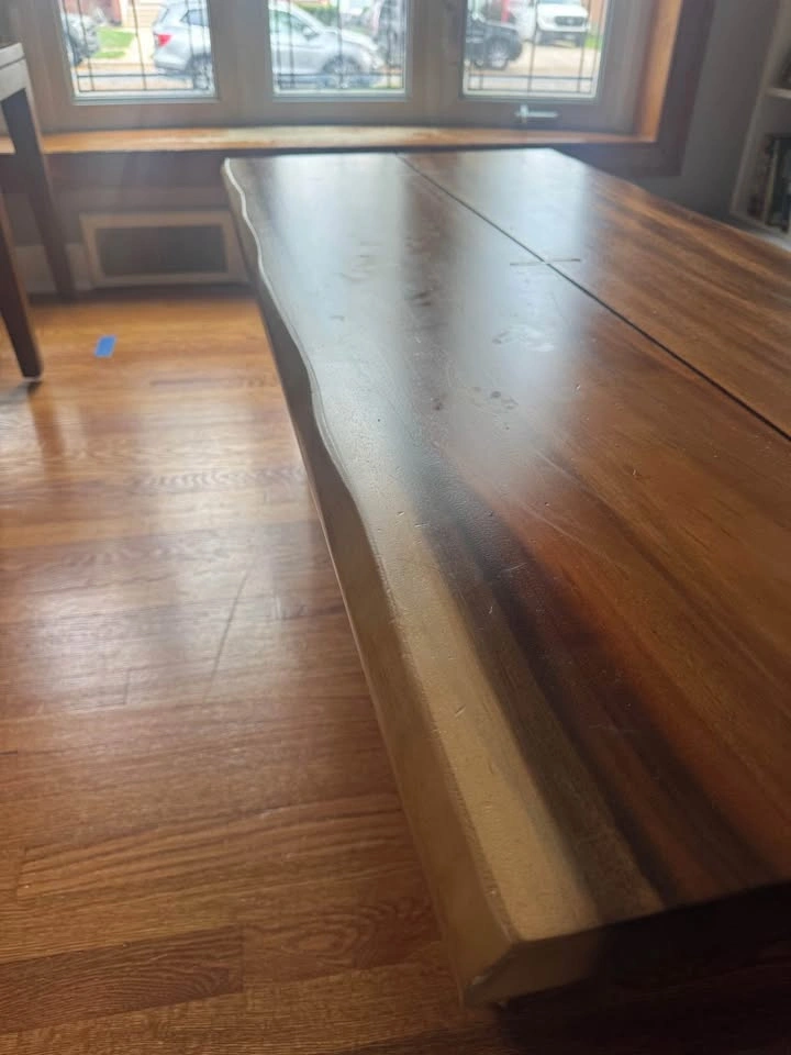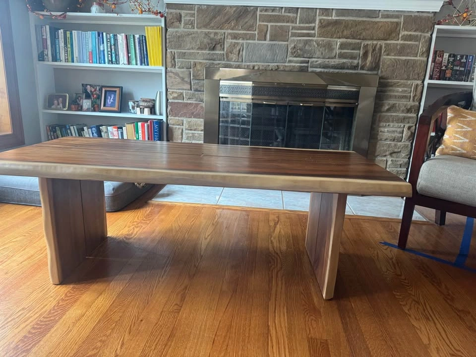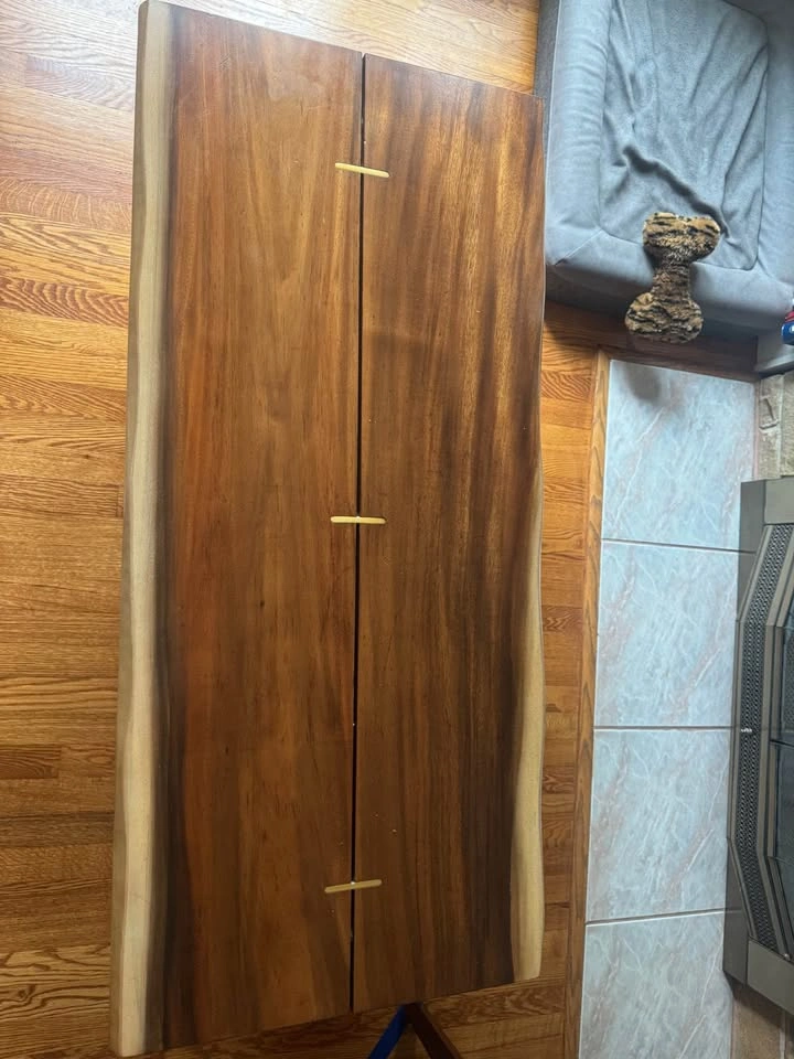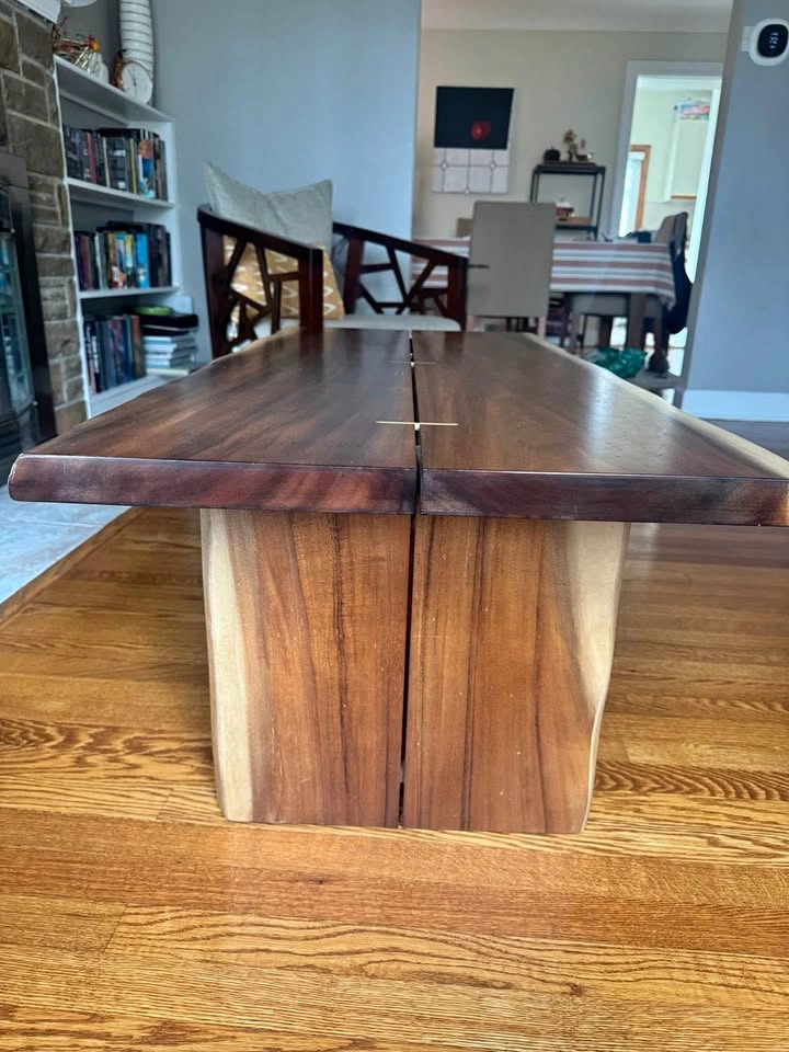 65Rustic Pecan Live Edge Wood Coffee Table from World Market. I paid $350 last year, it's on sale for $250 now. Overall: 52"W x 23.62"D x 17.83"H, 54 lbs. Leg height: 17.83"H Made of sugar wood, composite wood and suar veneer with rustic-pecan finish and metal inlays. Due to live-edge wood, variations will occur. Dust with dry, lint-free cloth. World Market exclusive.