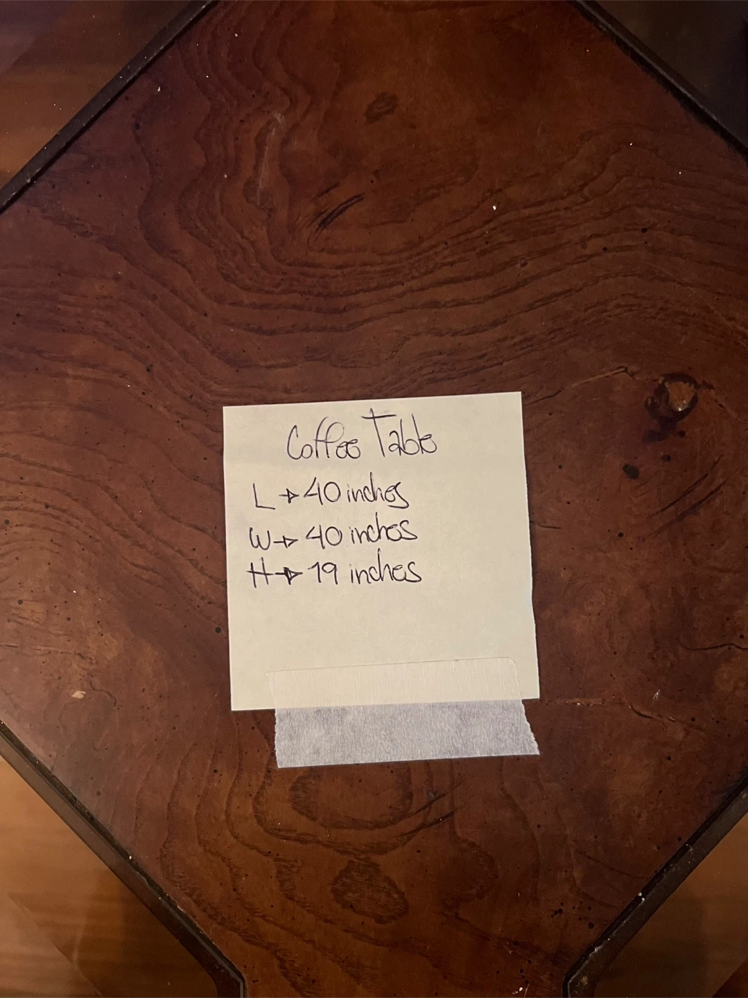 Coffee table with a wood frame and glass inserts. It's 40 inches long, 40 inches wide, and 19 inches high
