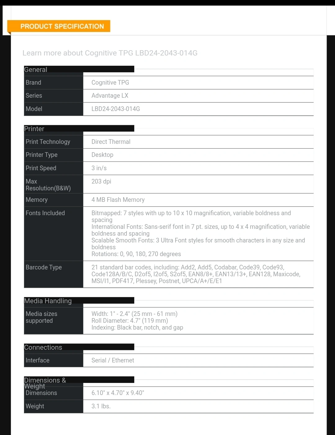 Selling a Cognitive TPG Advantage LX 203dpi Barcode Label Printer. Key specs: - Print Technology: Direct Thermal - Print Speed: 3 in/s - Max Resolution (B&W): 203 dpi - Dimensions: 6.10" x 4.70" x 9.40" - Weight: 3.1 lbs Originally priced at $725