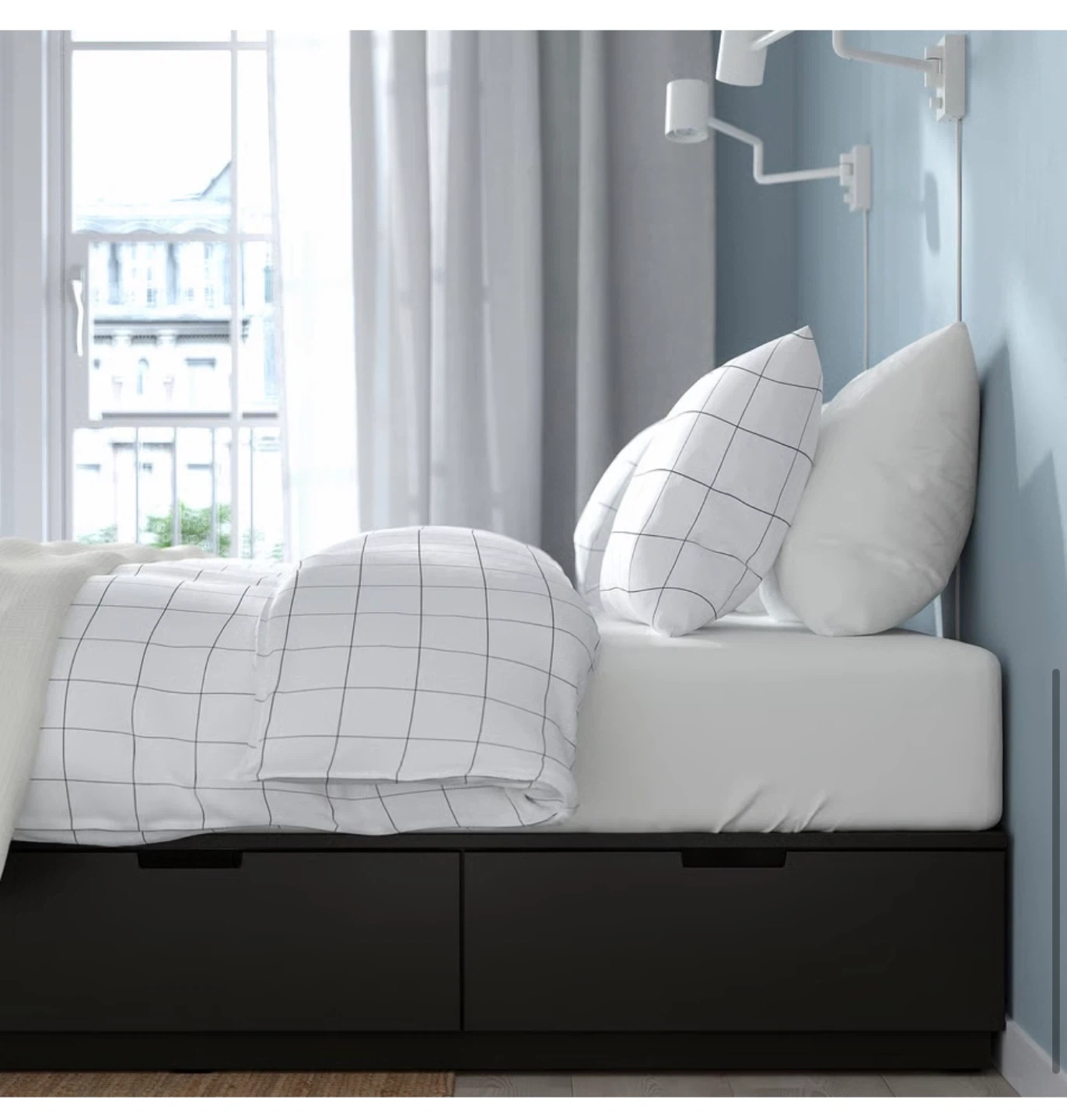 This is an IKEA MALM bed frame in black-brown. It's a queen size with four built-in storage drawers. The total length is 202 cm and width is 242 cm. Minor scratches on drawers