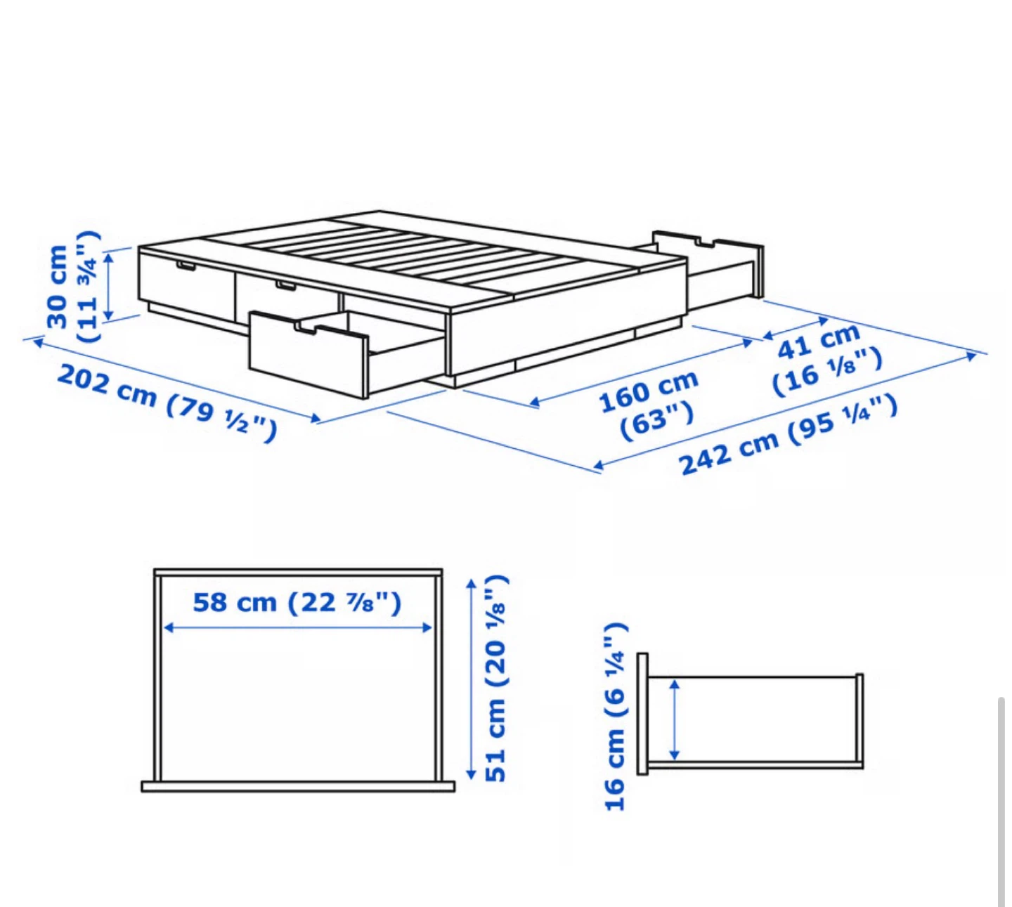 This is an IKEA MALM bed frame in black-brown. It's a queen size with four built-in storage drawers. The total length is 202 cm and width is 242 cm. Minor scratches on drawers