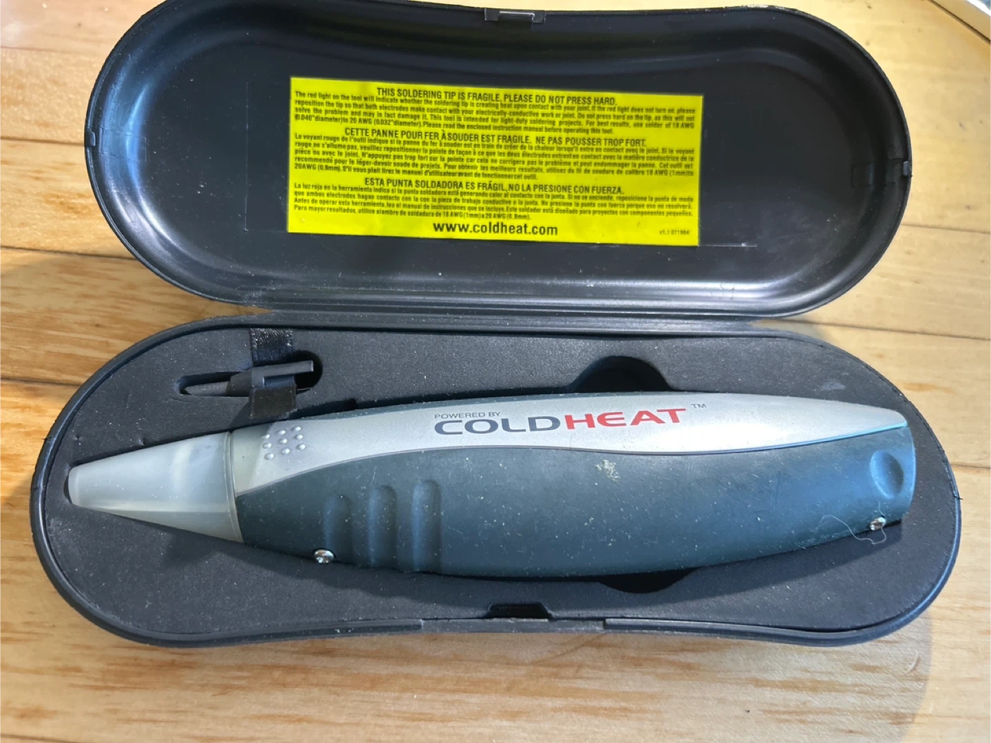Cold Heat soldering tool in its original case. The red light on the tool indicates whether the soldering tip is creating heat upon contact with your joint. This tool is intended for light-duty soldering projects. For best results, use solder of 18 AWG.