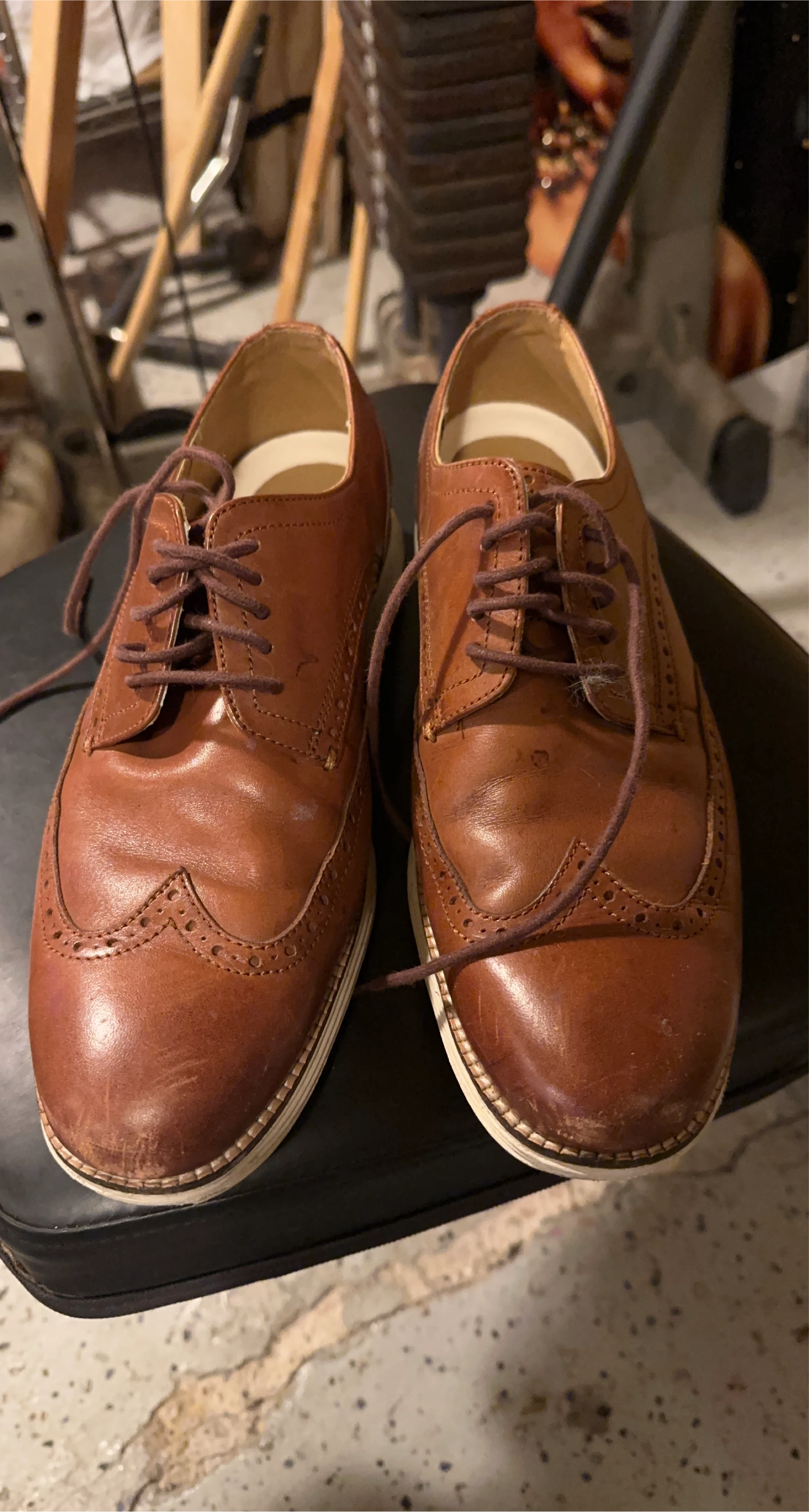 Selling a pair of Cole Haan wingtip oxford shoes in brown leather. They show some signs of wear, as you can see in the pictures.