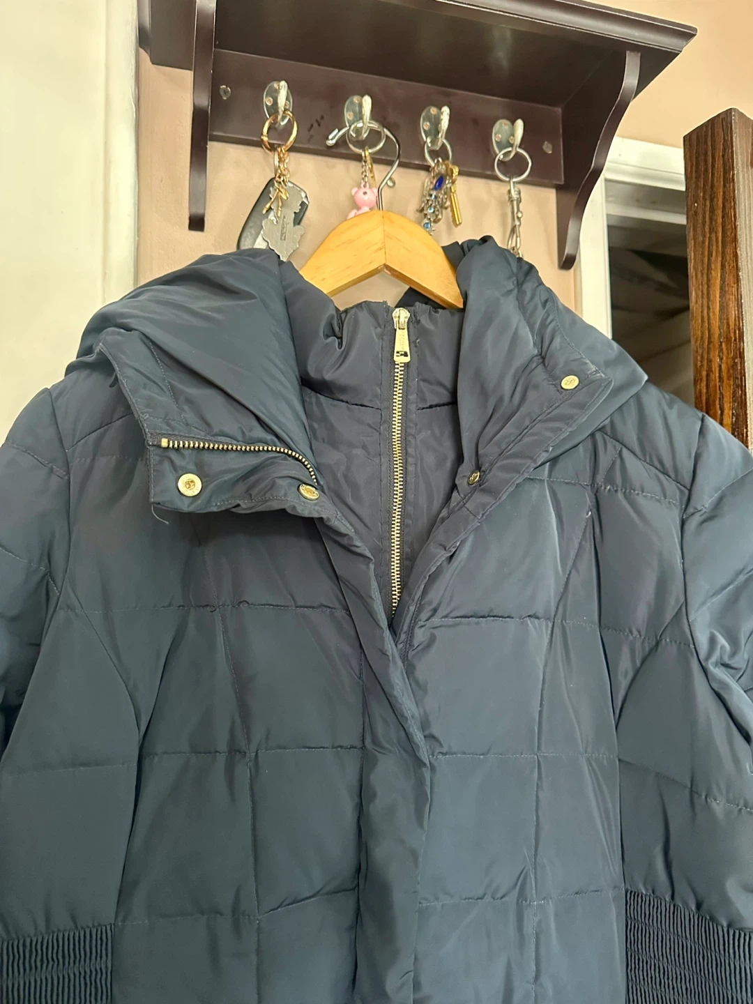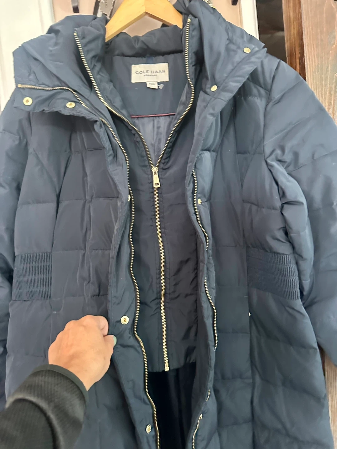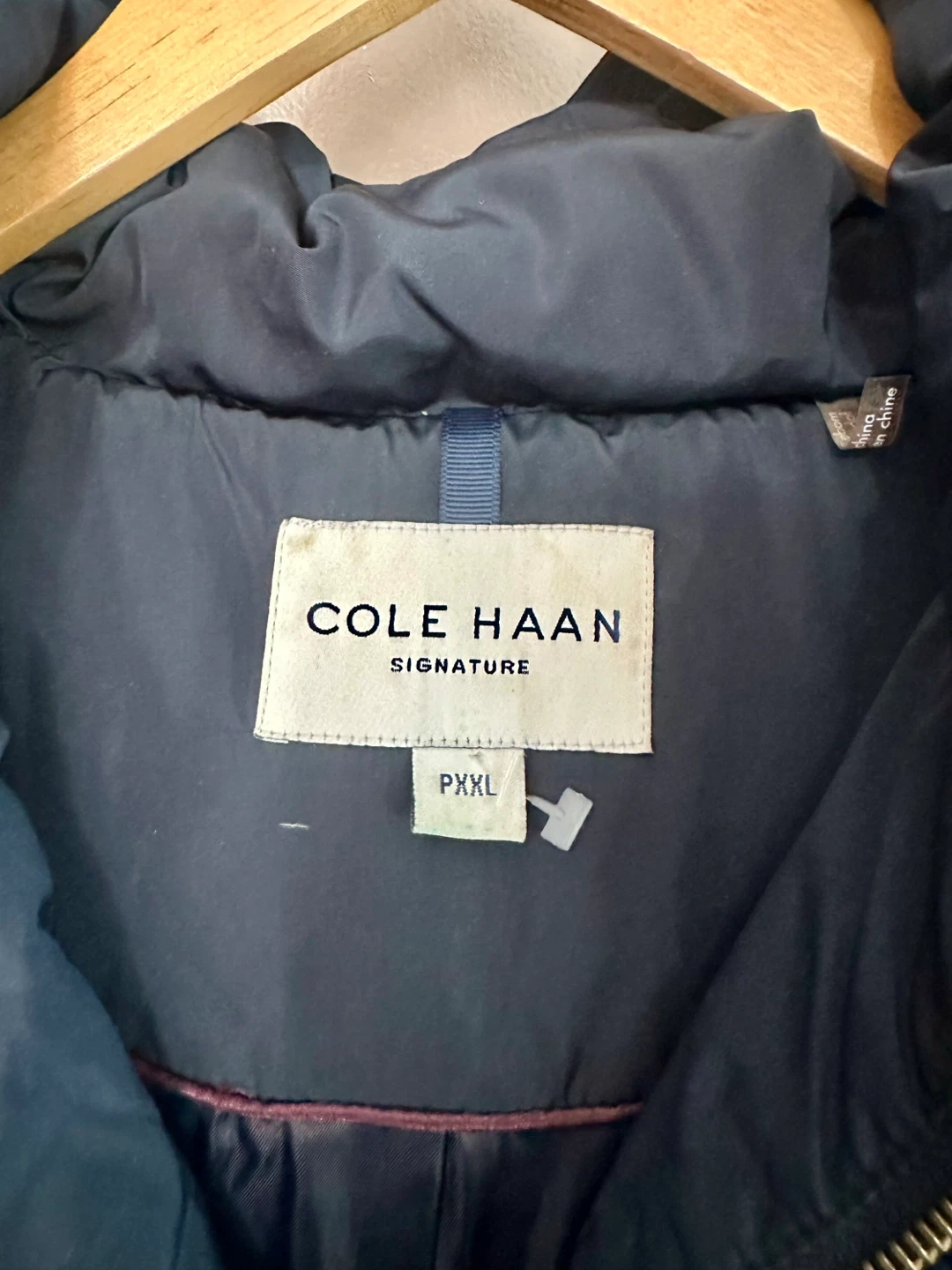 Selling a Cole Haan Signature down puffer coat in size PXXL. It's a stylish and warm coat perfect for colder weather. The coat features a hood and the color is navy blue. Please note that the coat has double zipper for the vested as well as the outer part plus button enclosure however the outer zipper does malfunction at times.
