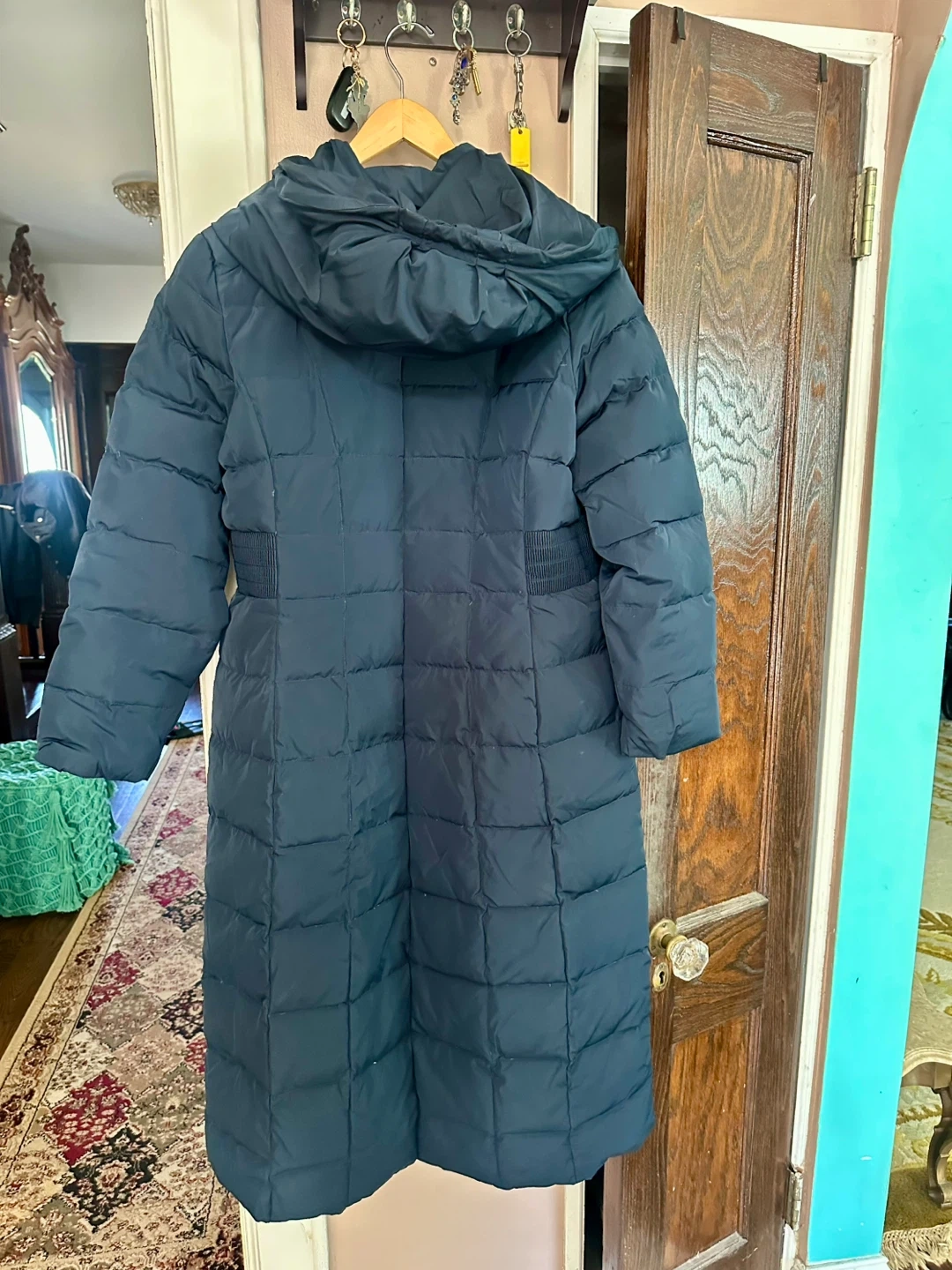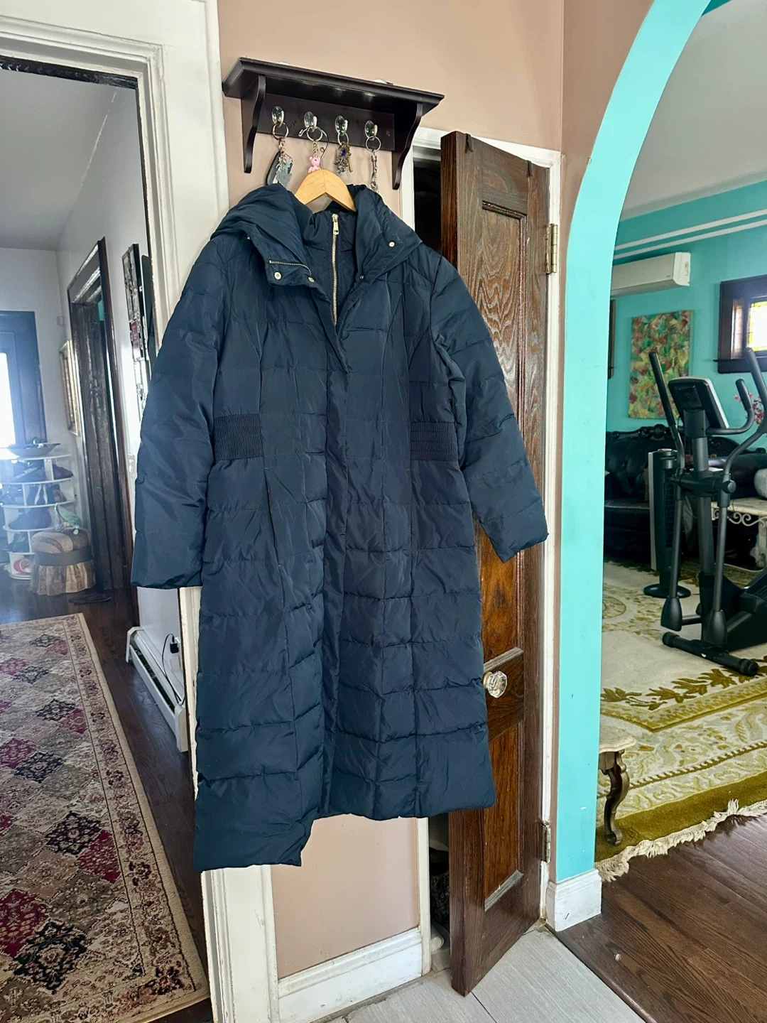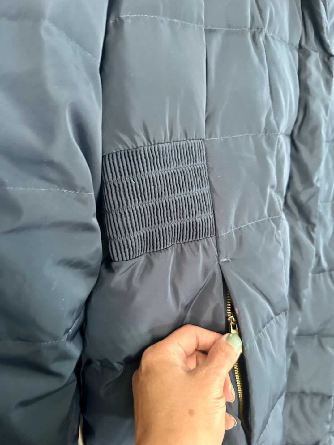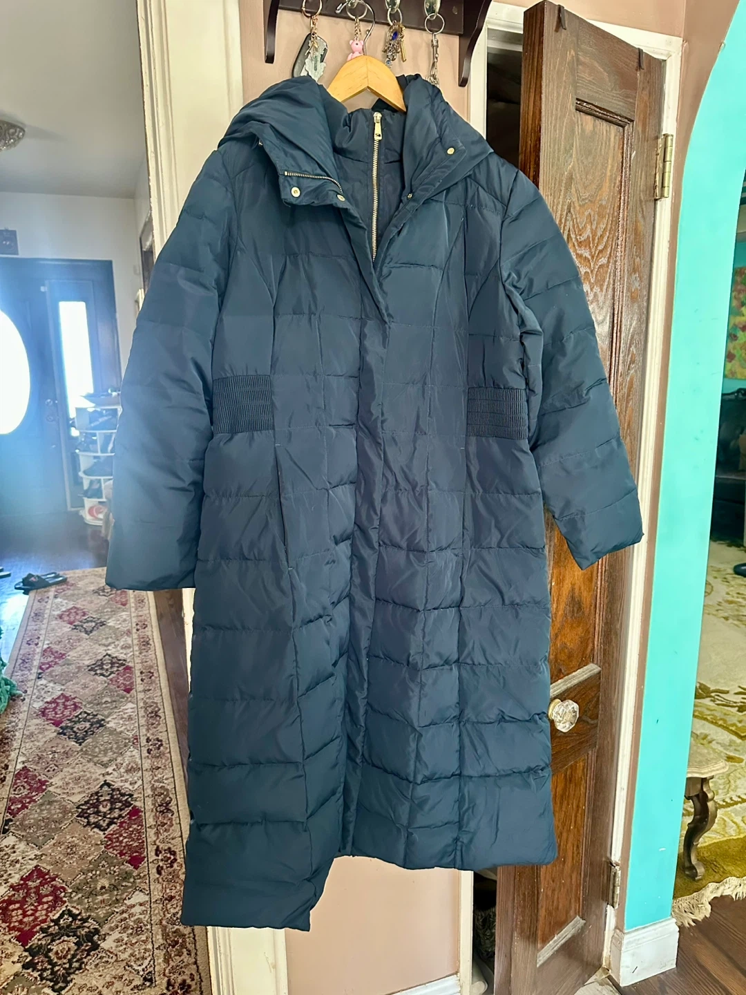 Selling a Cole Haan Signature down puffer coat in size PXXL. It's a stylish and warm coat perfect for colder weather. The coat features a hood and the color is navy blue. Please note that the coat has double zipper for the vested as well as the outer part plus button enclosure however the outer zipper does malfunction at times.