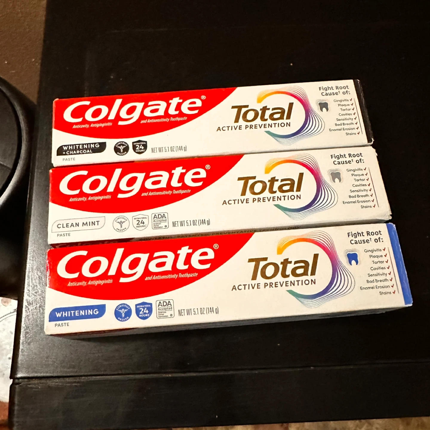 12Selling three tubes of Colgate Total Active Prevention toothpaste Each tube is 5.1 oz (144 g) Expiration dates: - February 2027 - March 2027 - May 2027 3 for $9 or 1 for $3 each