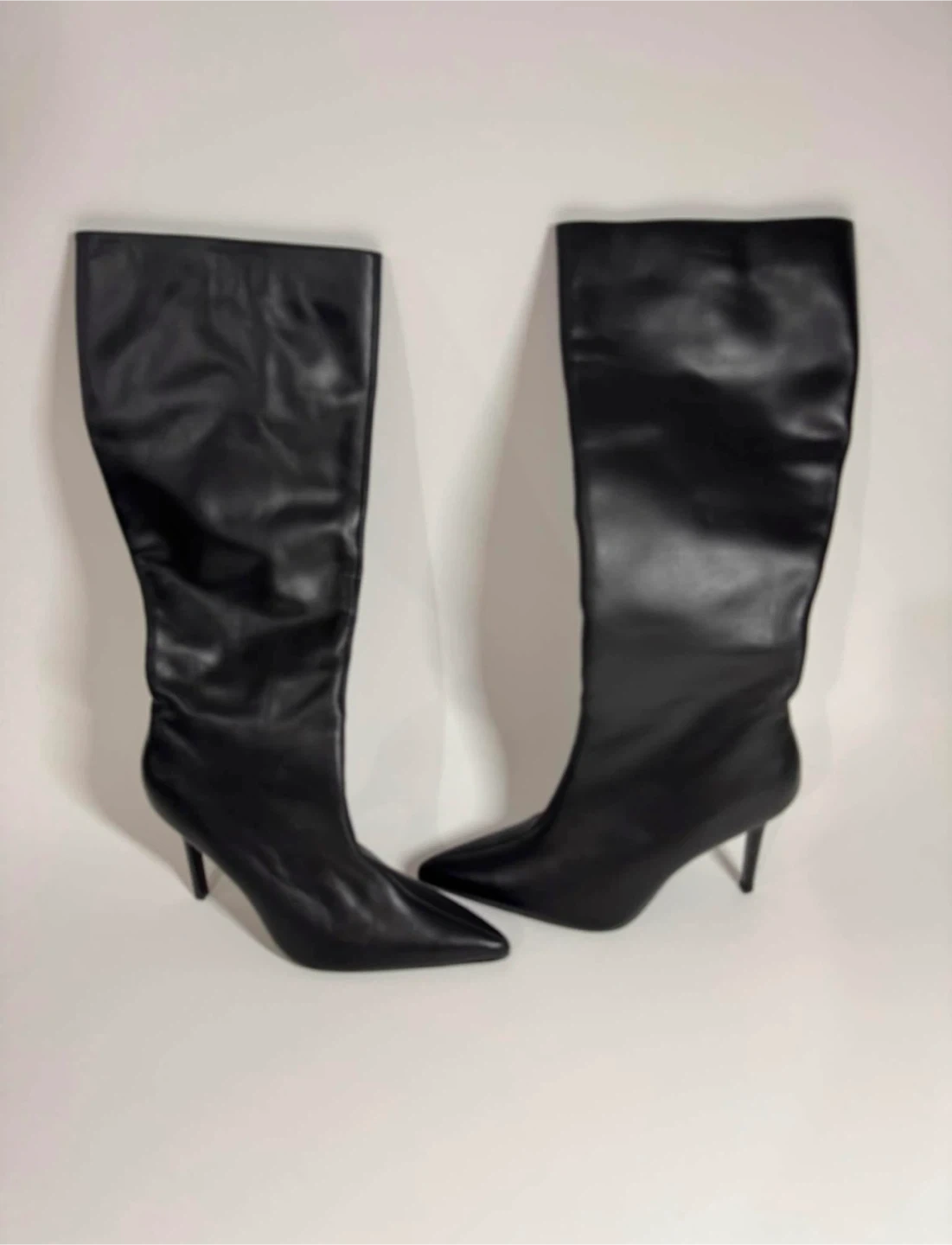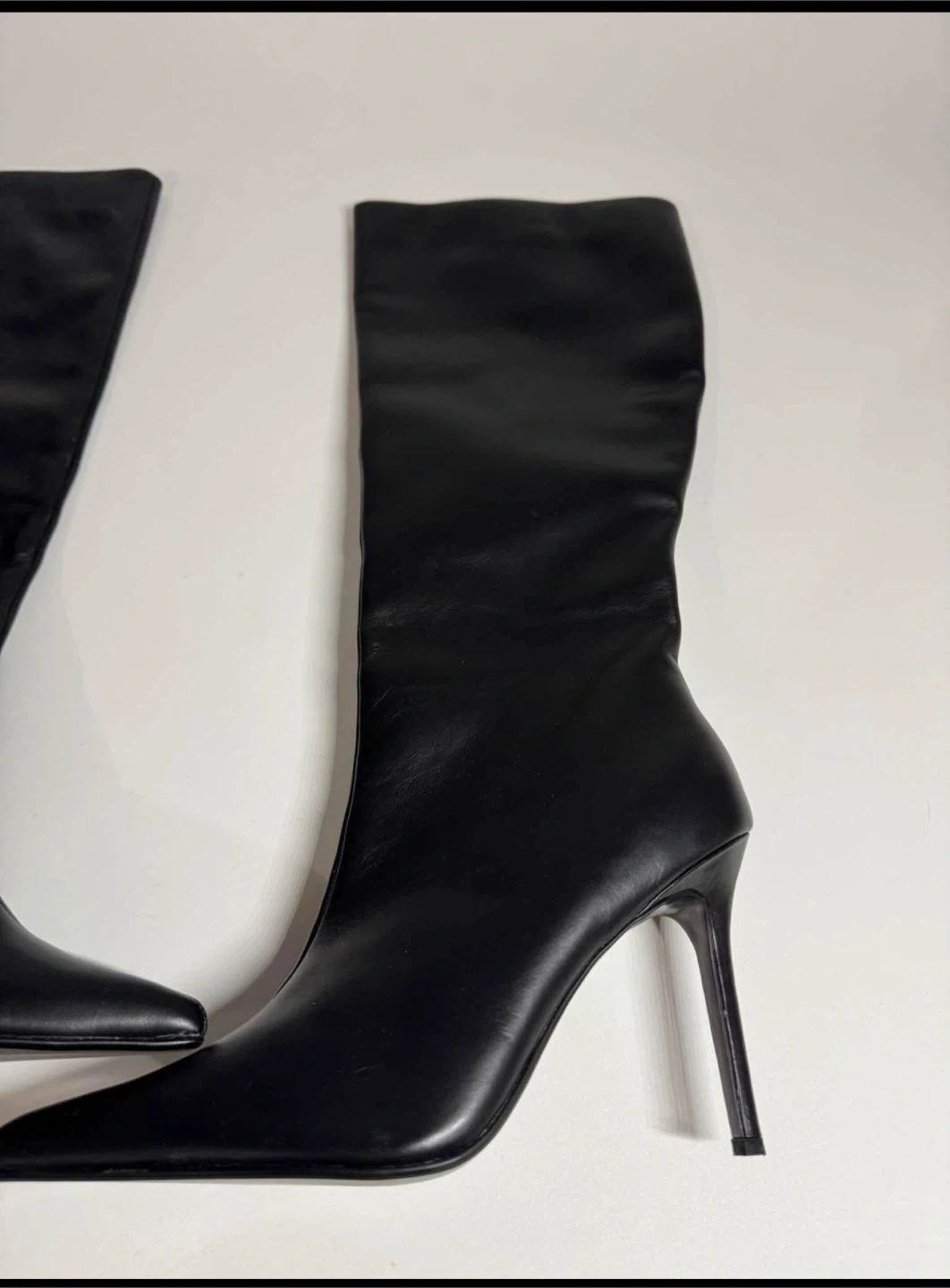 10Selling a pair of sleek black knee-high heel boots. They feature a pointed toe and a slim heel, perfect for adding a touch of elegance to any outfit. The boots have a zipper closure for easy wear.