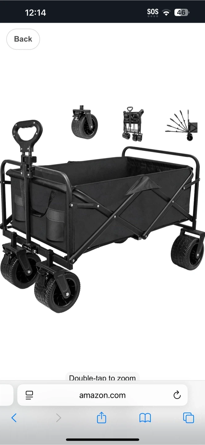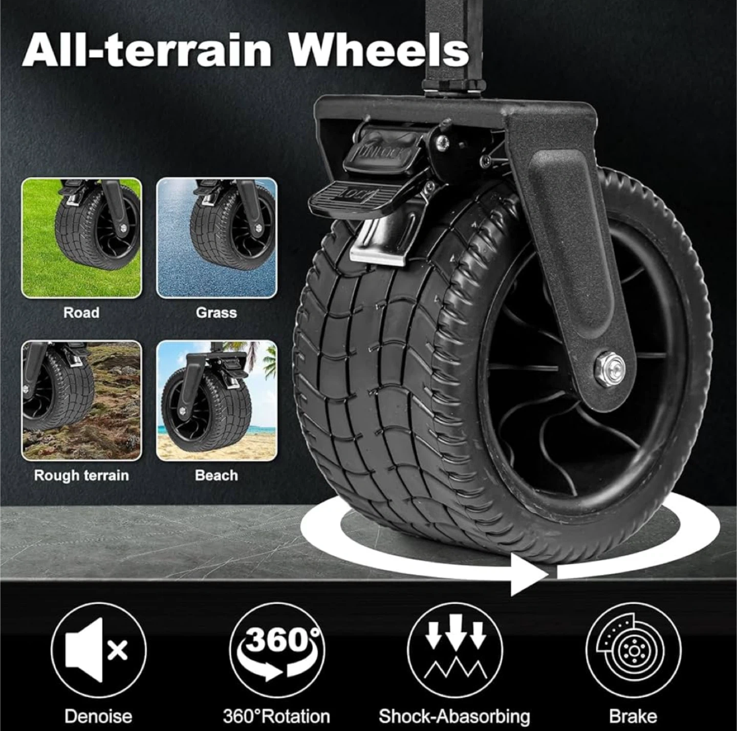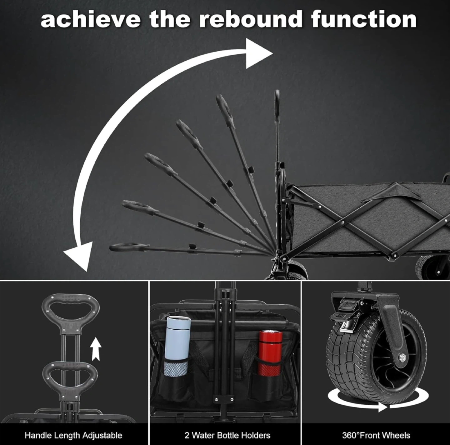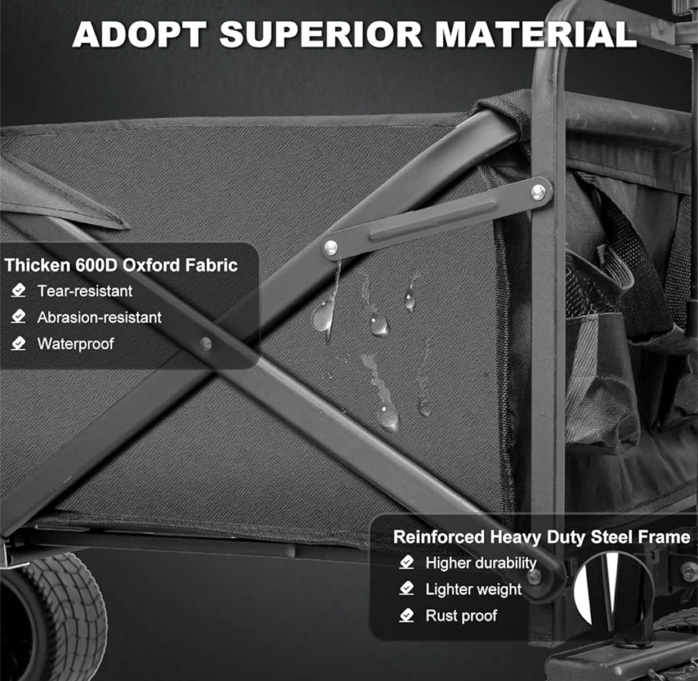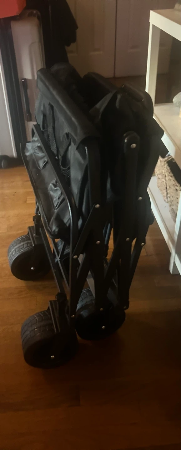 40.5"D x 32.7"W x 24"H *LIKE NEW-ONLY USED ONCE-Purchased on Amazon for $85 back in May 2025* Extra Large Capacity:Equipped with high quality heavy duty metal frame to load up to 220LBS,Outside Dimensions Appro:36.2" L x 22.4" W x 14.2" H. Sets up in seconds, No assembly required! Highest Quality:The 7.9" diameter big all-terrain wheels ensure a smooth ride on any road, and the front wheels have a 360-degree free rotation with high-precision steel shafts for maximum flexibility and control. The waterproof fabric is 600D Oxford, Will not tear when sharp objects are placed inside. Multifunction:The handle length of this folding garden cart can be extended from 26" to 35.4".Flexible handle could achieve the rebound function and keep it upright.You don't have to bend over to reach the handle.Two Mesh Cup holders to keep your beverages secure