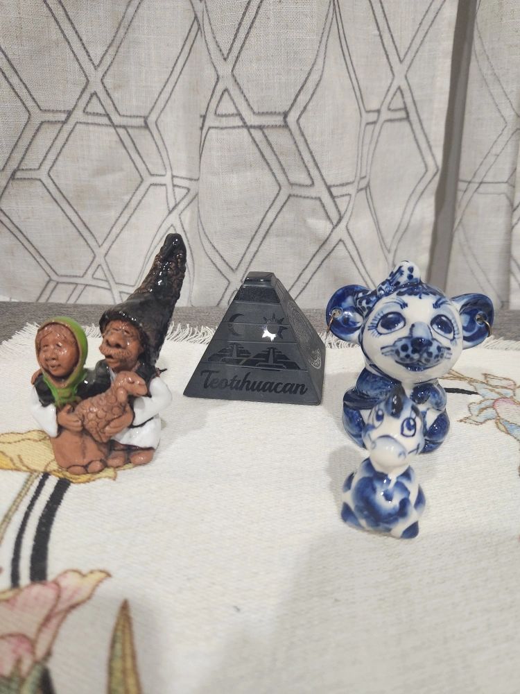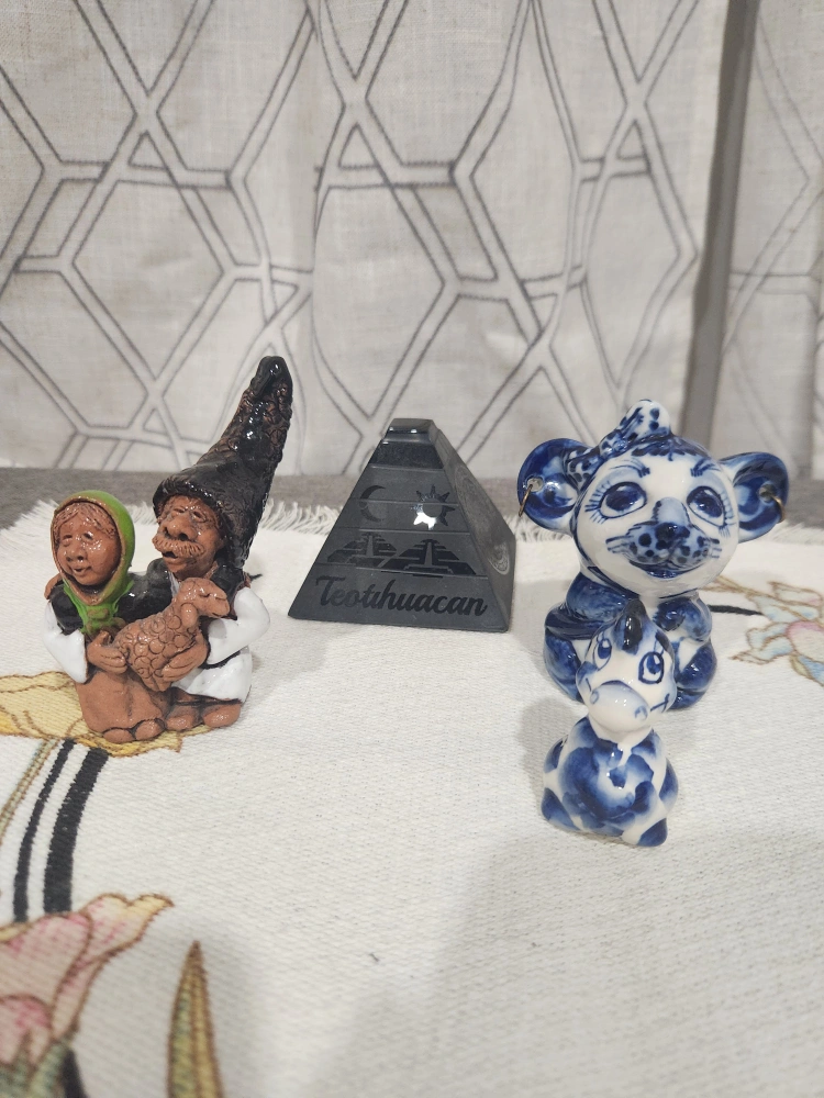 Set of three unique figurines. Includes a small Teotihuacan pyramid, a terracotta gnome figurine, and two small Delftware-style animal figurines. Great for collectors or home decor.