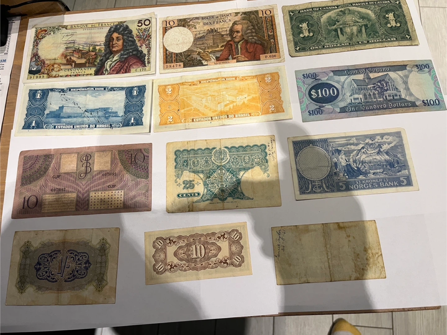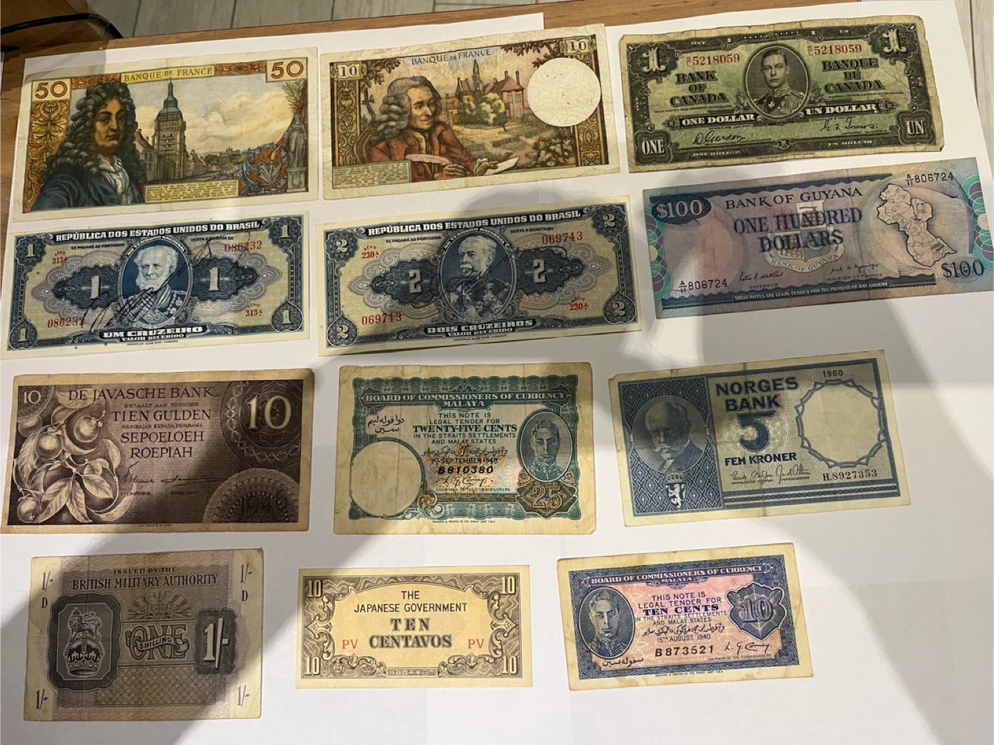 Collectible Foreign Paper Money From Various Countries: - France: 1970 20&50 Francs - Malaya: 1940 10 & 25 Cents - Japanese: Ten Centavos - Norway: 1960 5 Kroner - British: 1 Shilling - Guyana: One Hundred Dollars - Brazil: 1 & 2 Cruzeiros - Canada: 1937 One Dollar - Netherlands: Tien Gulden *MAKE AN OFFER after researching their Values*