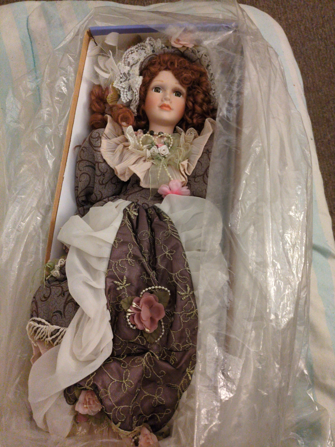 Doll with curly red hair. Wearing a decorative dress with floral details. Comes in its original box. You could imagine this lovely doll would brighten your room.