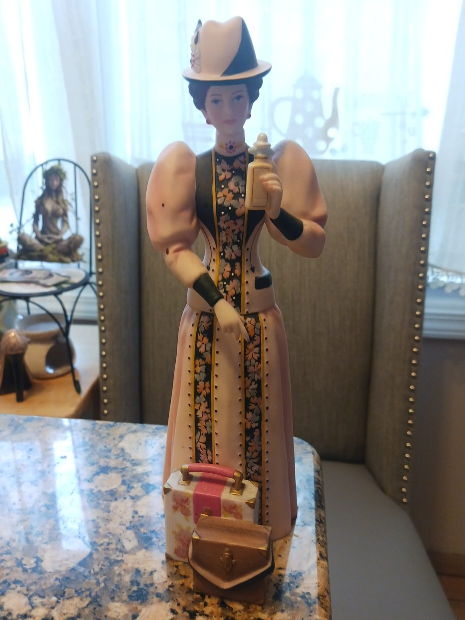 This is a beautiful Victorian lady figurine. She is holding a bottle and standing next to two small suitcases. She would make a great addition to any collection!