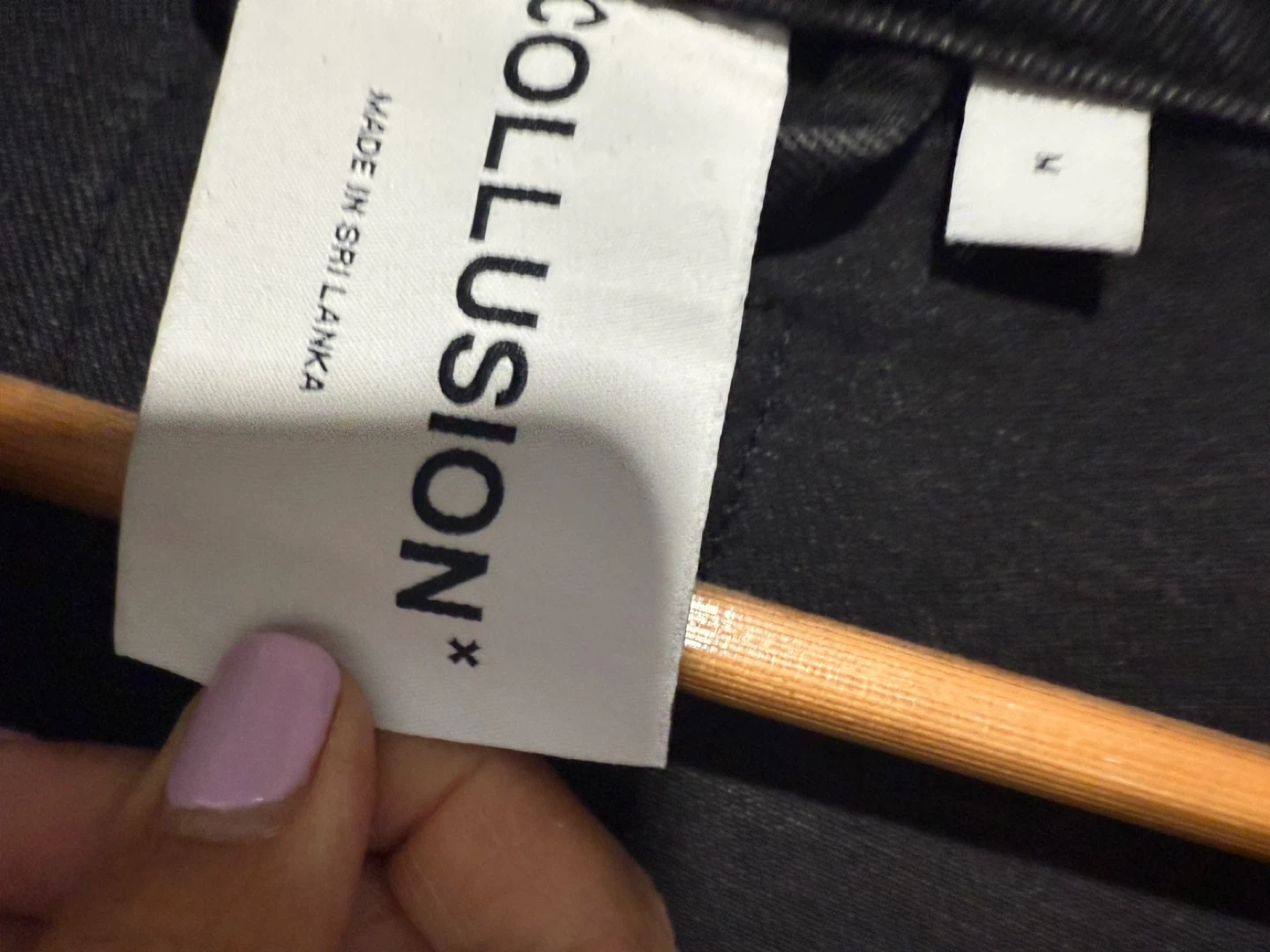Selling a black denim jacket from COLLUSION in size M. It's in great condition and ready for a new home! The jacket features a classic denim design with front pockets and button closure. Made in Sri Lanka