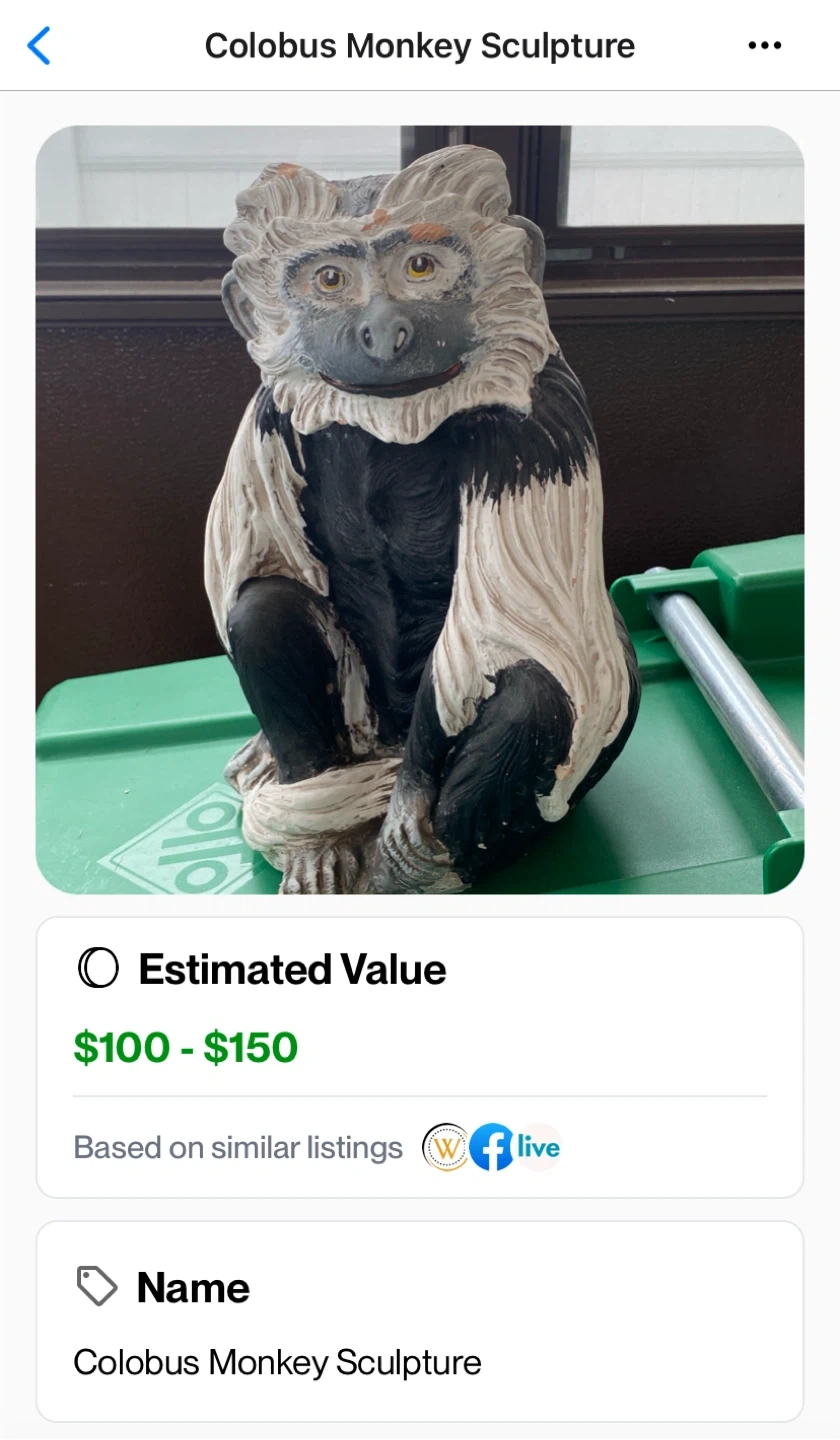 Selling a Colobus Monkey Sculpture. It has an estimated value between $100 and $150 based on similar listings