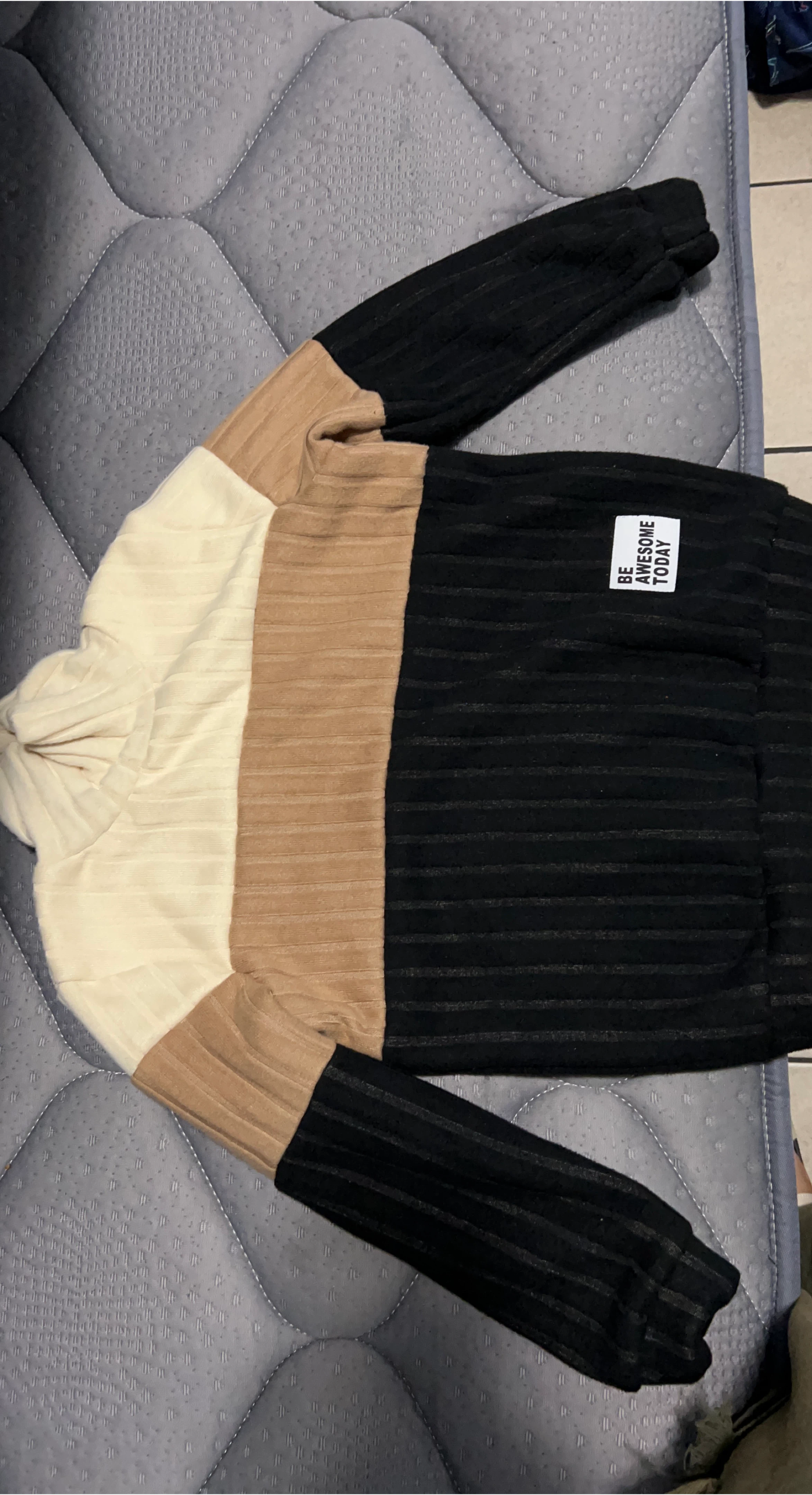 10Here's a cute color block long sleeve top! It features a black, tan, and white color scheme and the words 'BE AWESOME TODAY' on the front