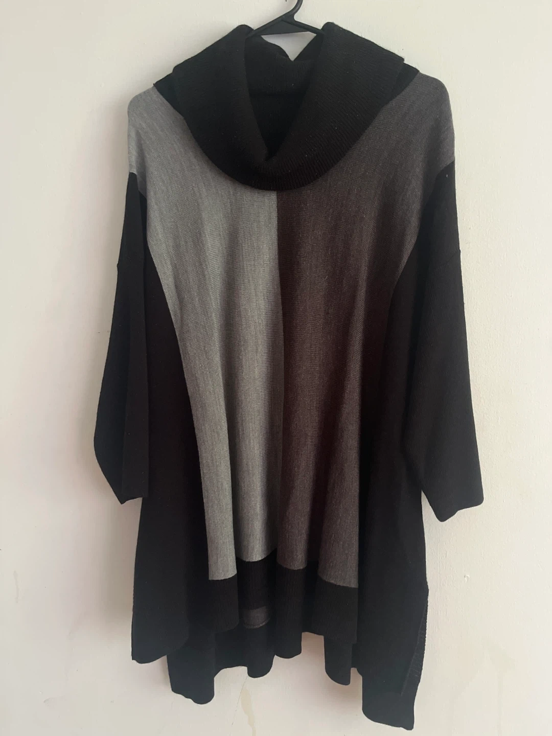 15Here's a stylish color block tunic sweater! It features a cowl neck and a relaxed fit. The colors are black, gray, and charcoal. It's perfect for layering or wearing on its own