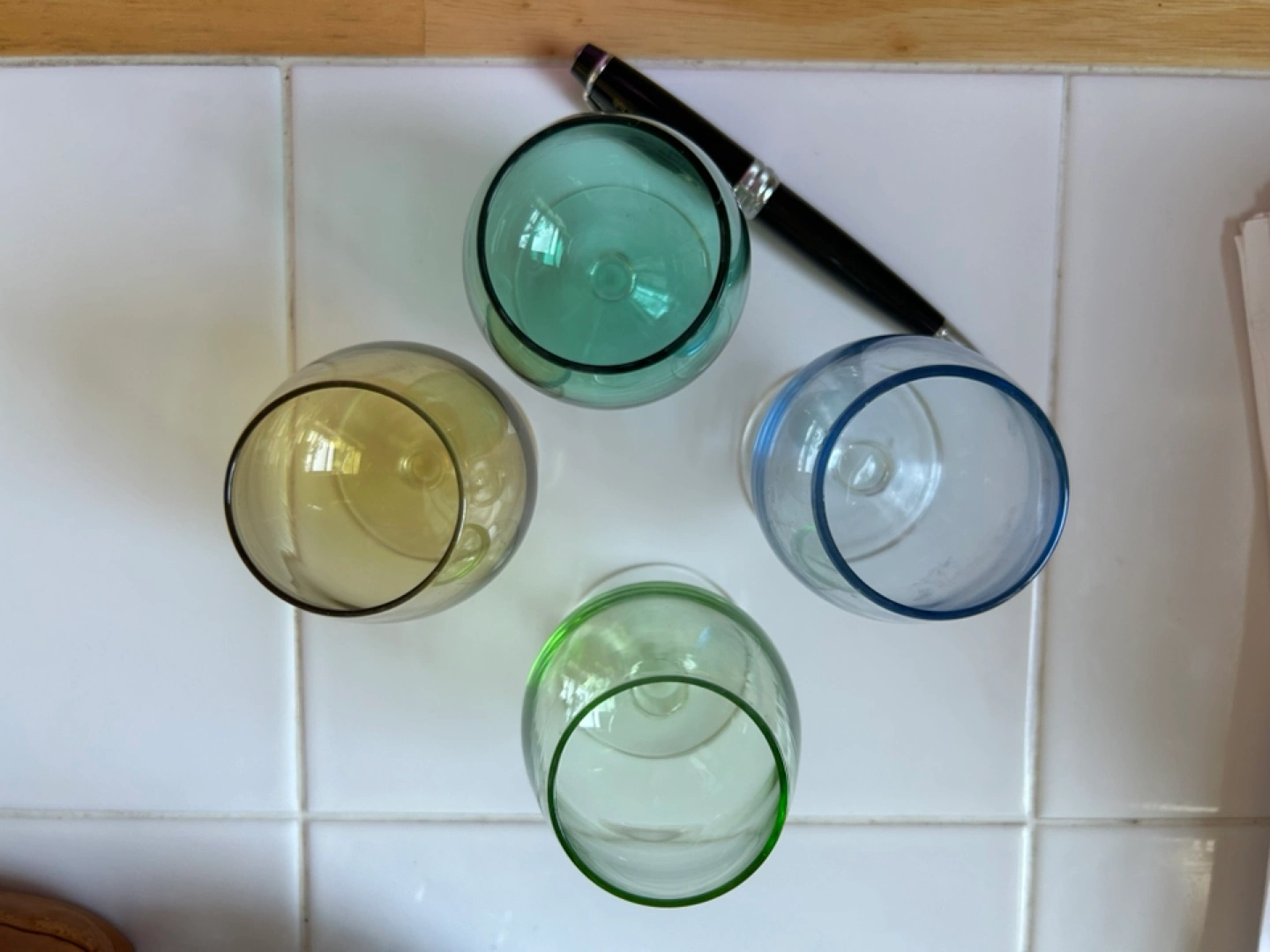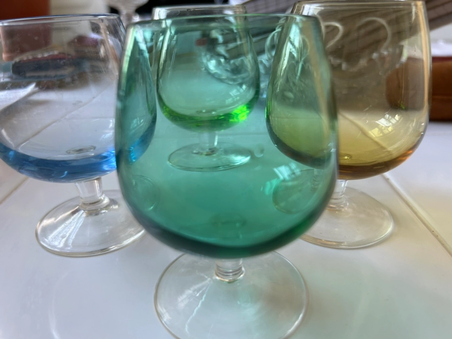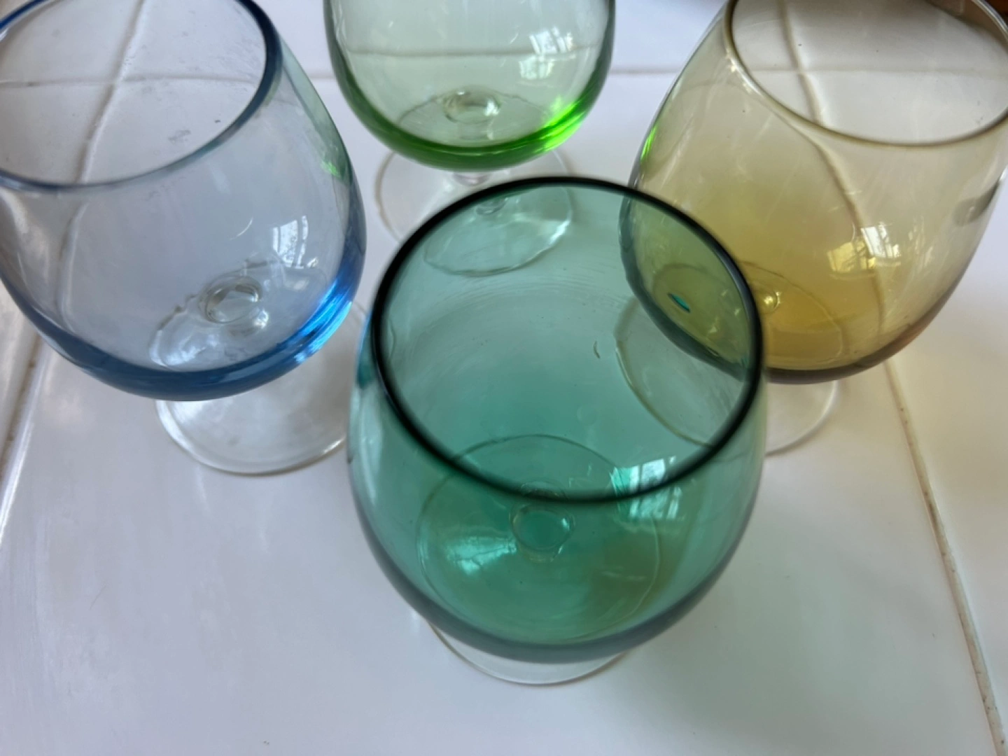 Selling a set of four colored glass brandy snifters. The colors are blue, green, yellow and dark green. They are in good condition and would be perfect for entertaining or adding a pop of color to your barware collection