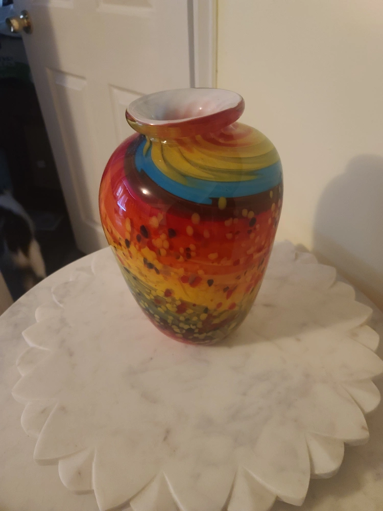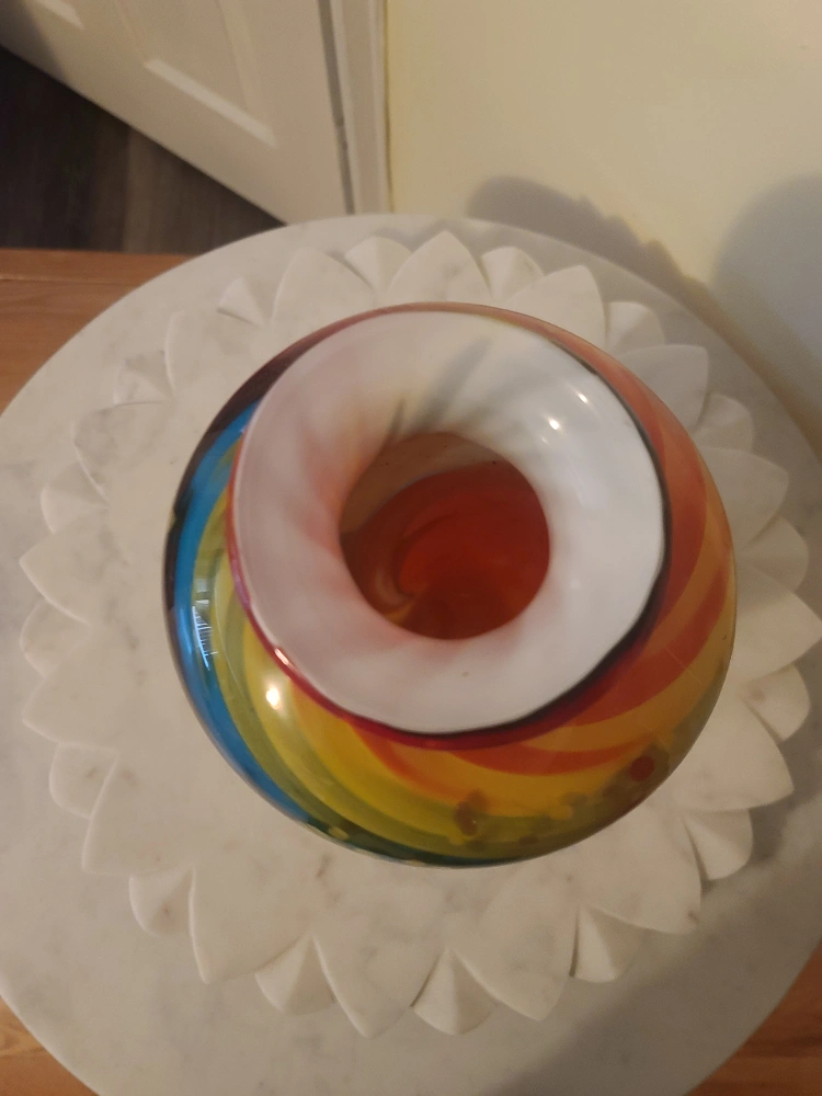 Selling a beautiful art glass vase with a vibrant, colorful design. It's in great condition and would make a lovely addition to any room. The vase features a unique swirl pattern with shades of red, yellow, blue, and green.Beautiful swirl color glass measuring 12” tall ,5lb heavy, murano style