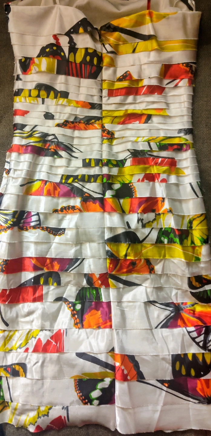 This dress features a colorful butterfly print. It has a layered, ruffled design and is perfect for a party or special occasion! The dress is in good condition and ready for a new home