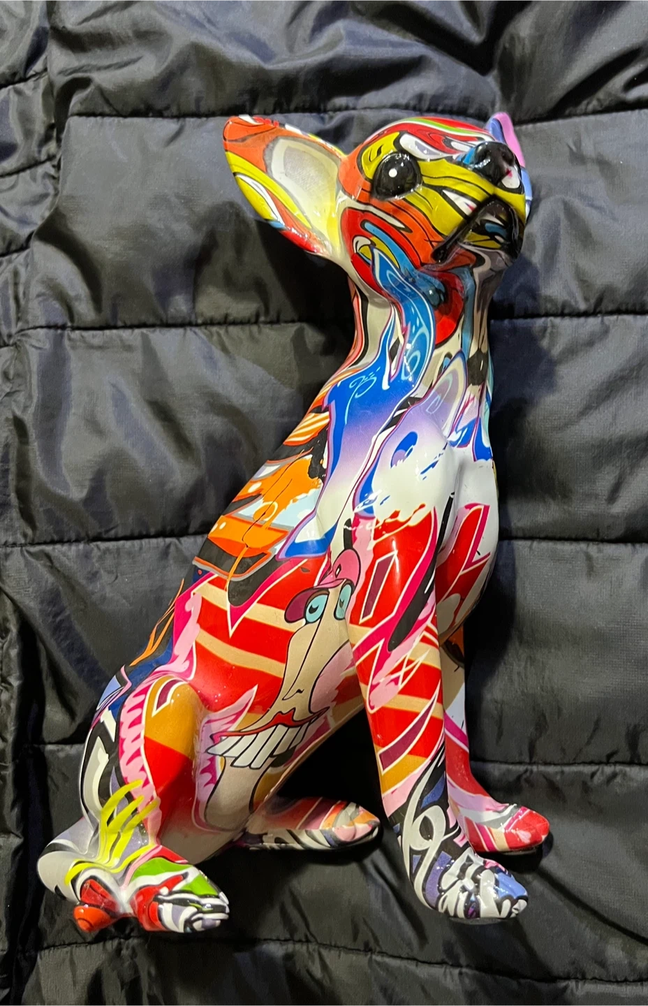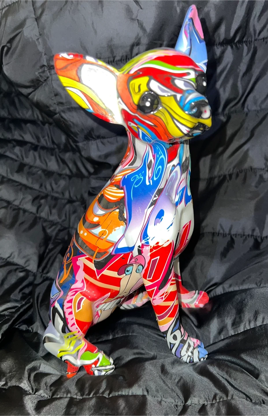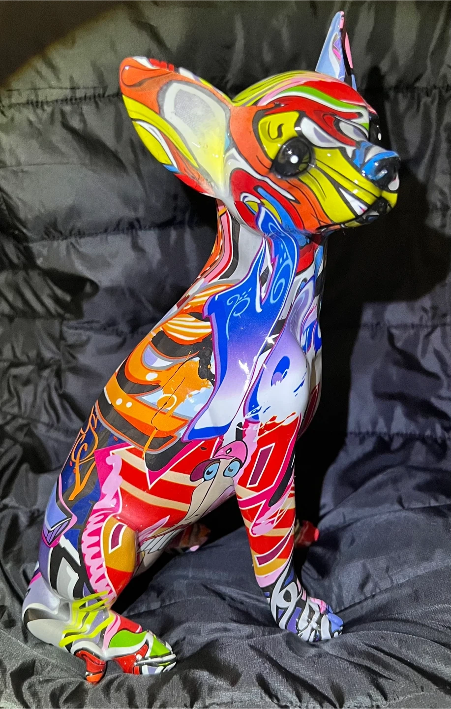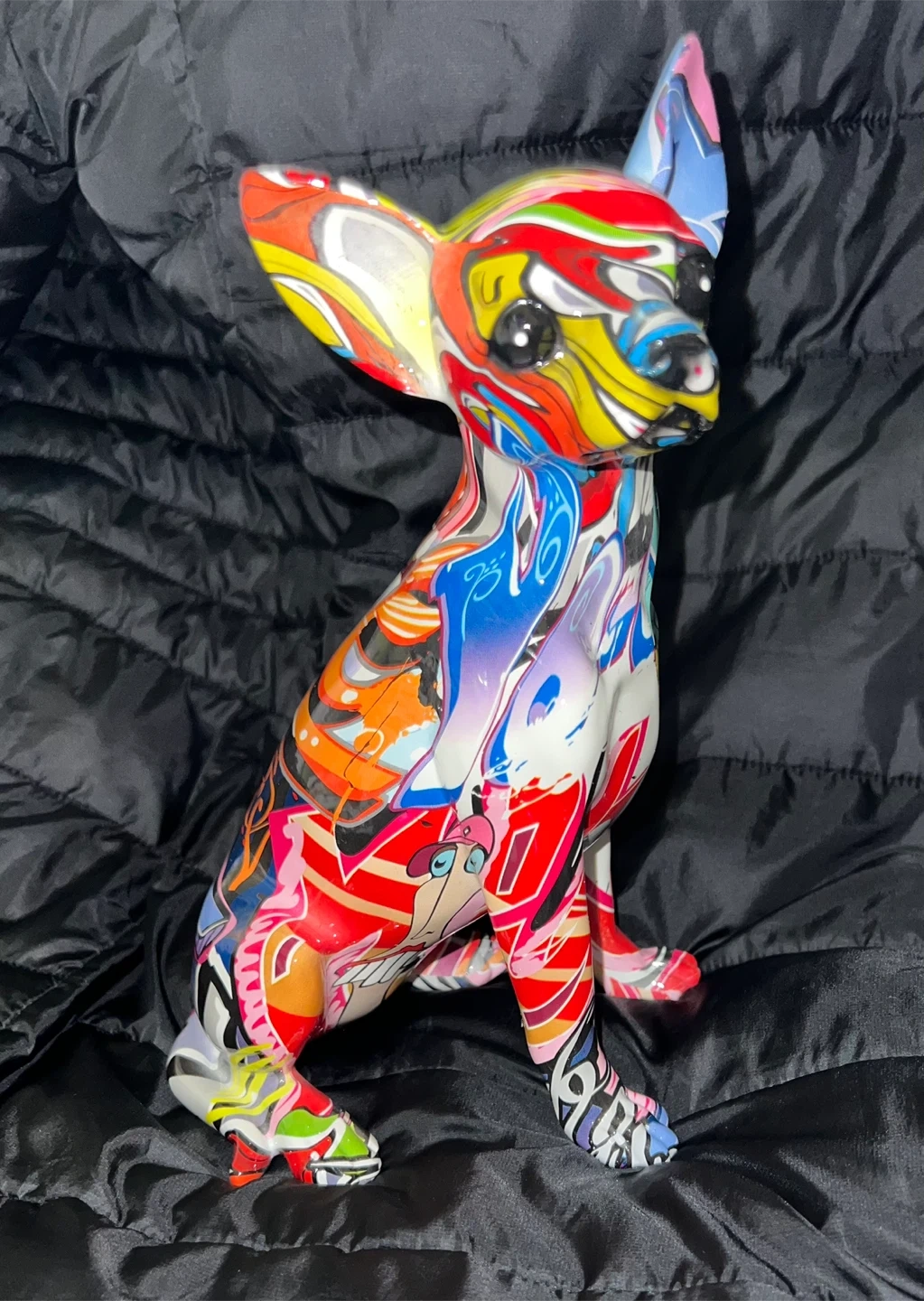 This is a colorful chihuahua figurine! It is covered in a variety of colors and designs. It would be a great addition to any collection!