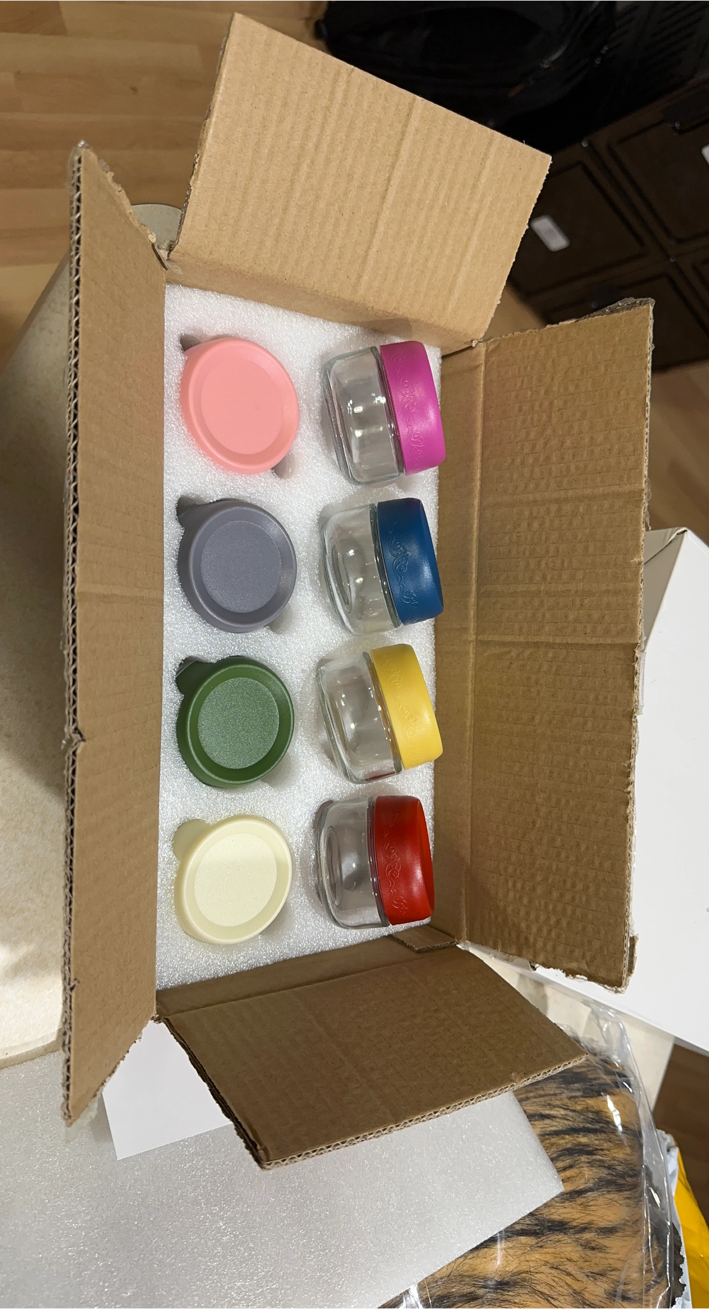 I'm selling a set of empty 2oz glass jars with colorful lids. They come in a variety of colors, including pink, gray, green, yellow, blue, and red. They're in a box, ready for you to use for your DIY projects or storage needs