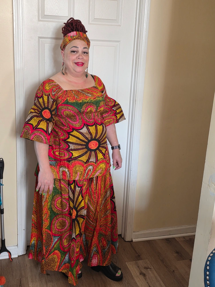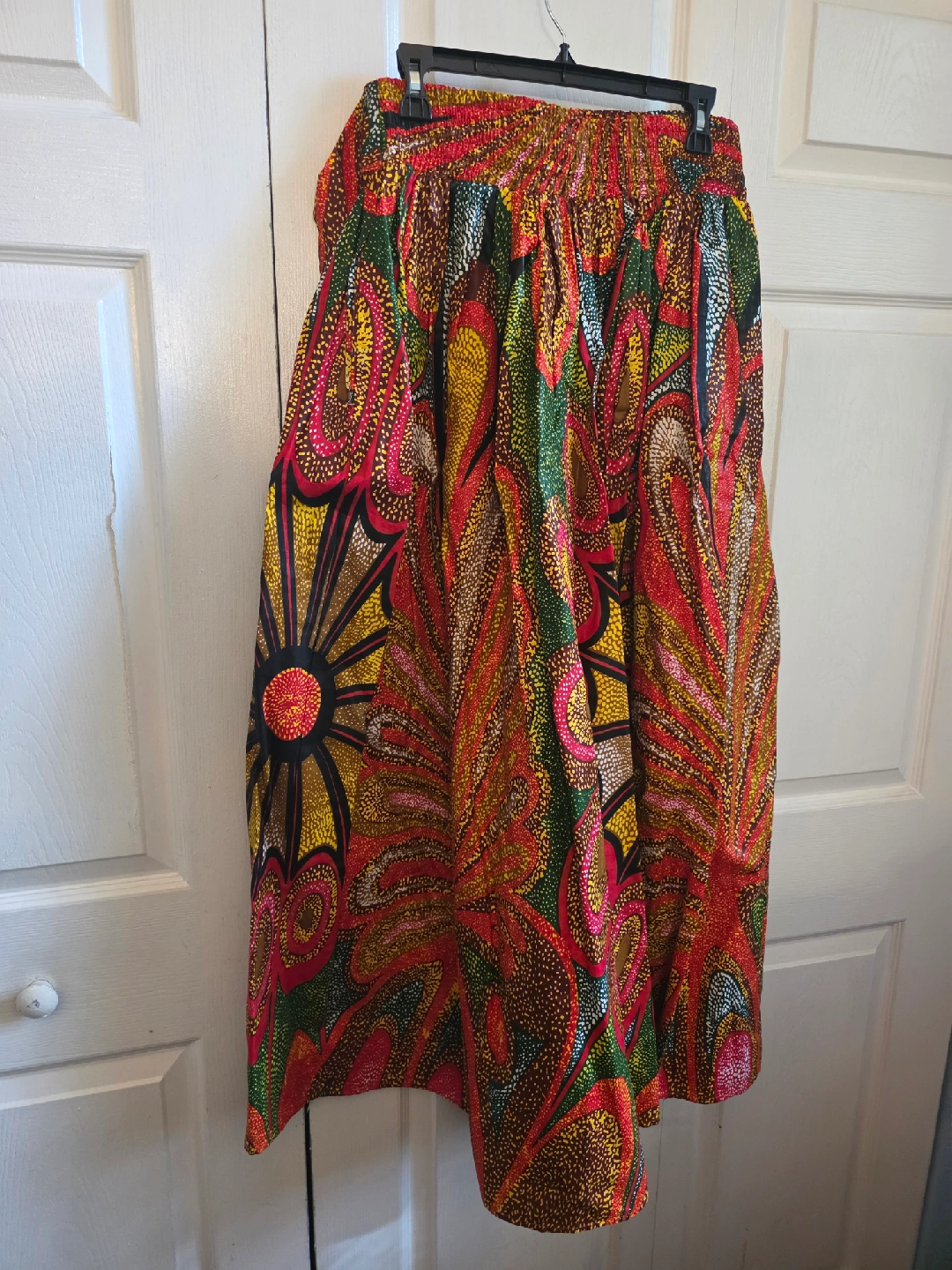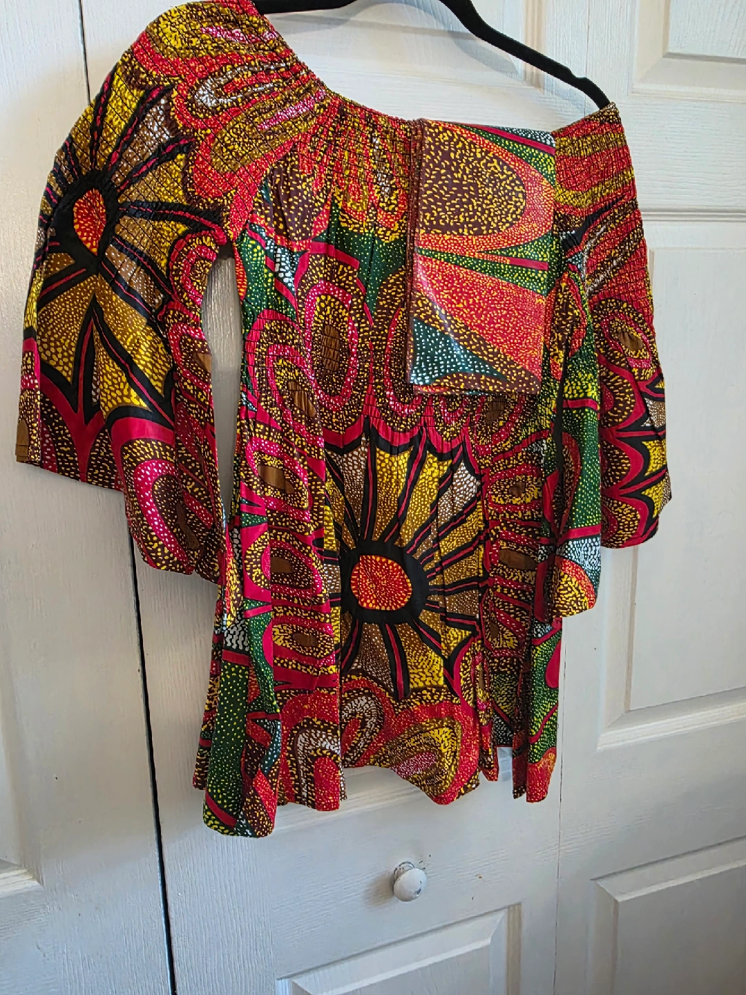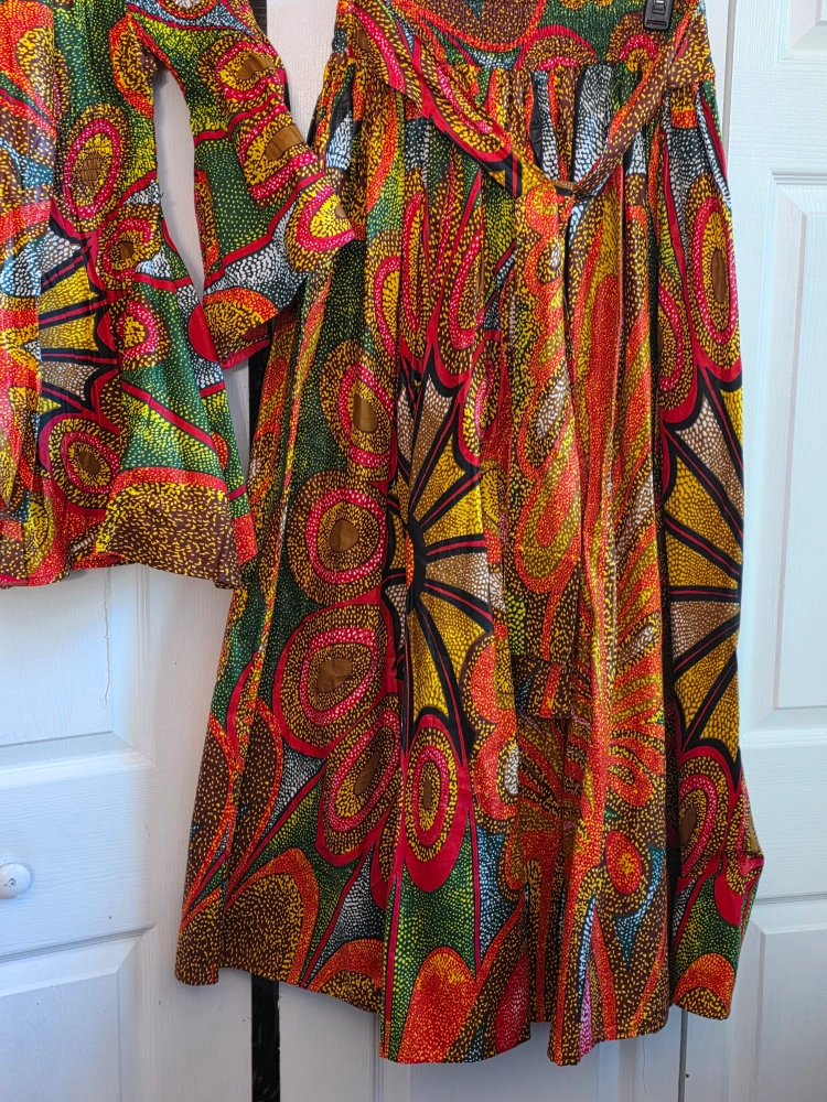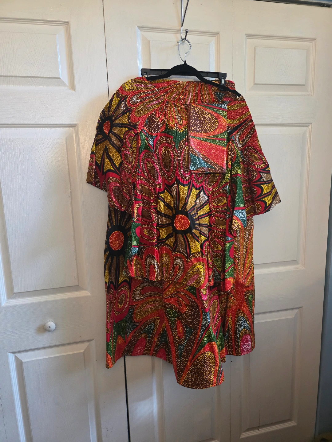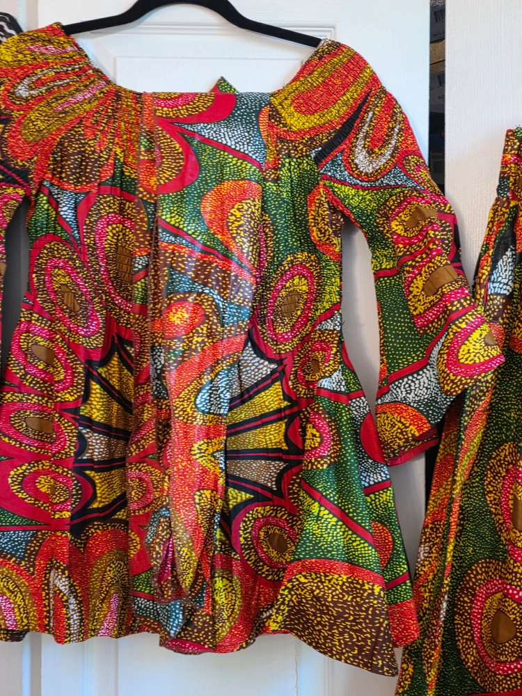 This is a vibrant two-piece set featuring a colorful floral print. The set includes a top and a pants, both with a matching design. Perfect for adding a pop of color to your wardrobe!