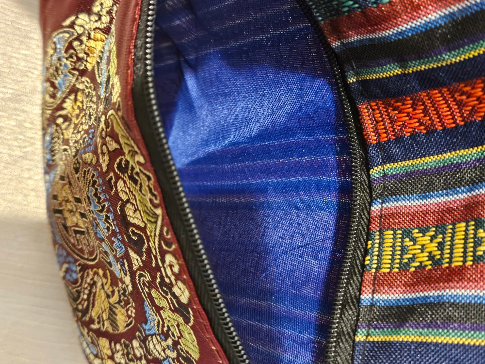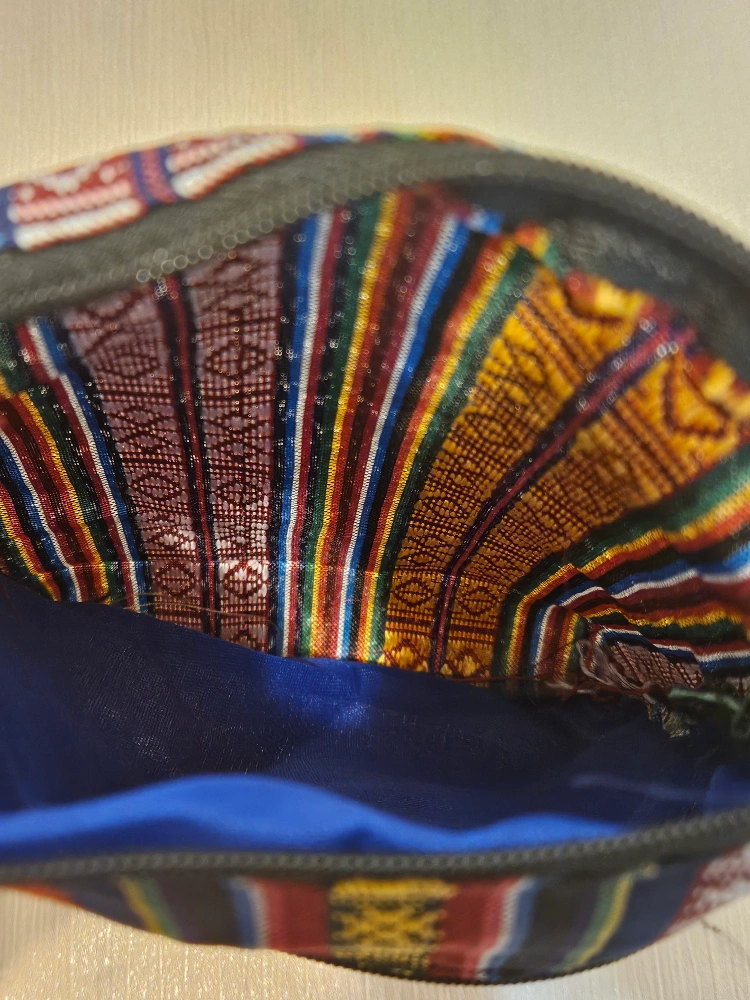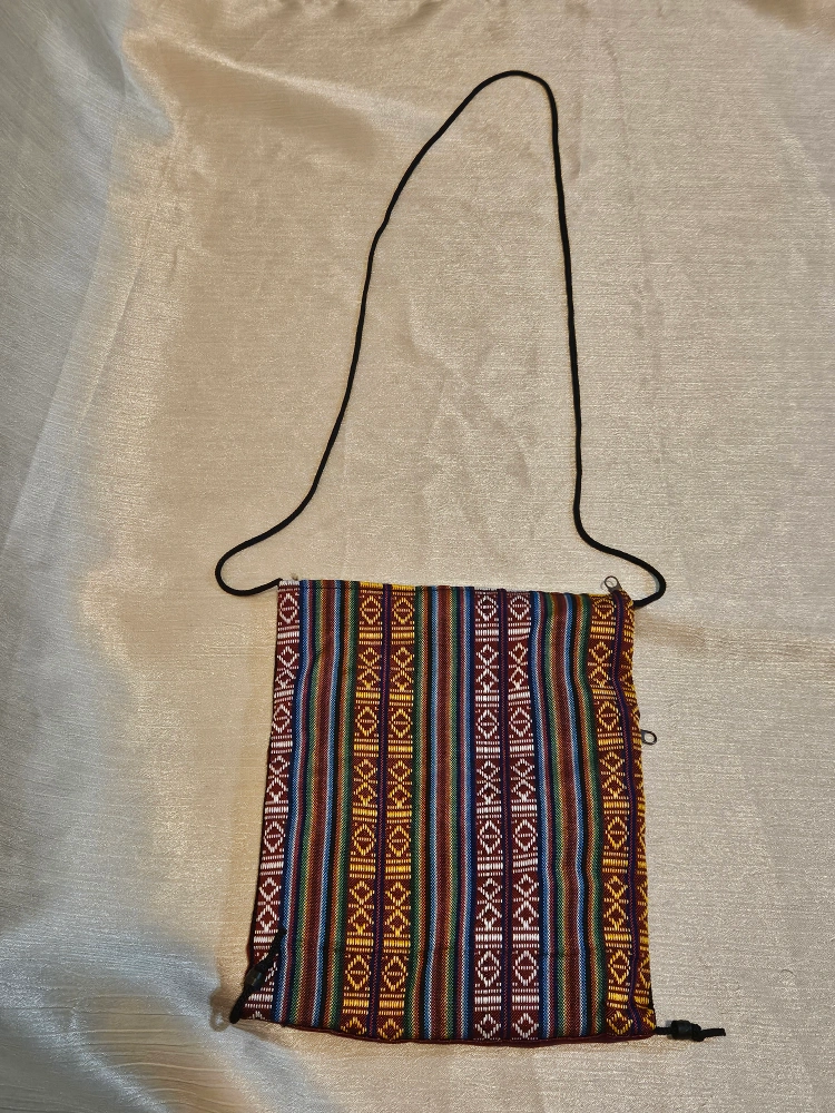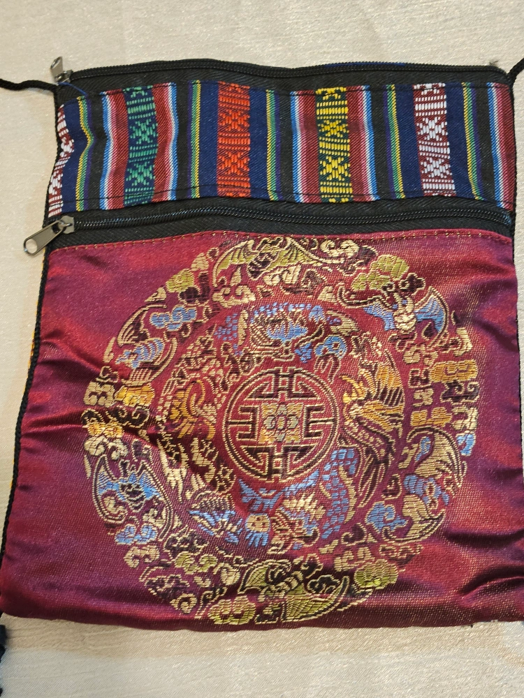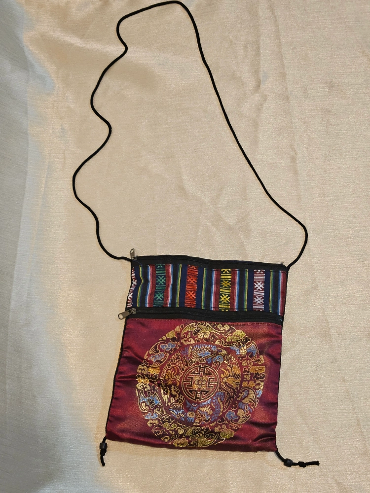 This is a unique crossbody bag with a colorful and intricate pattern. It has a zipper closure and a long strap for easy carrying. The bag features a beautiful design and is in great condition! Hand made in India