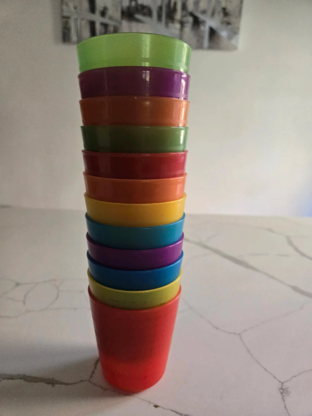 124I'm selling a set of 12 colorful plastic glass! They're perfect for kids, parties, or everyday use. These cups are in good condition and ready for a new home