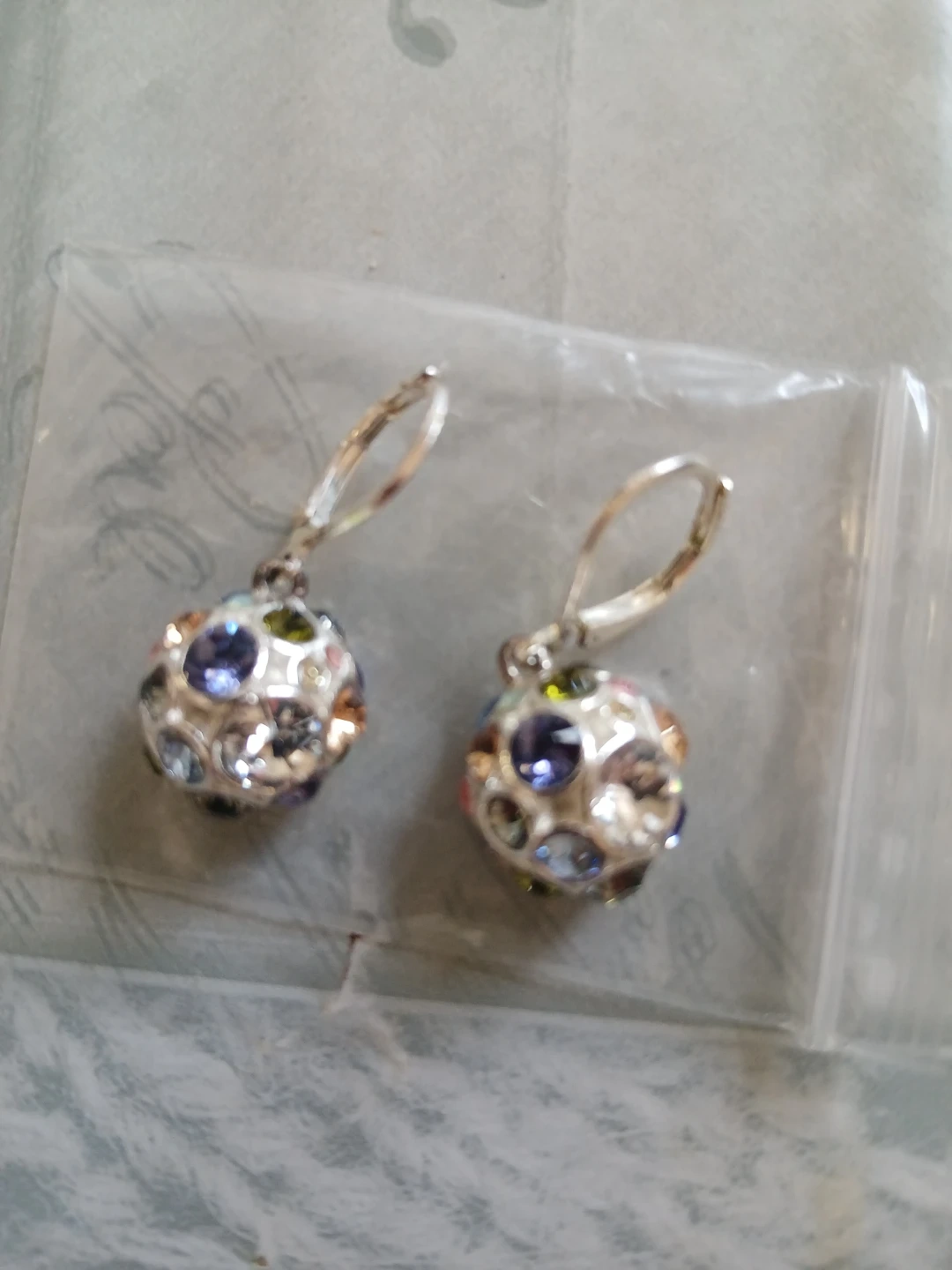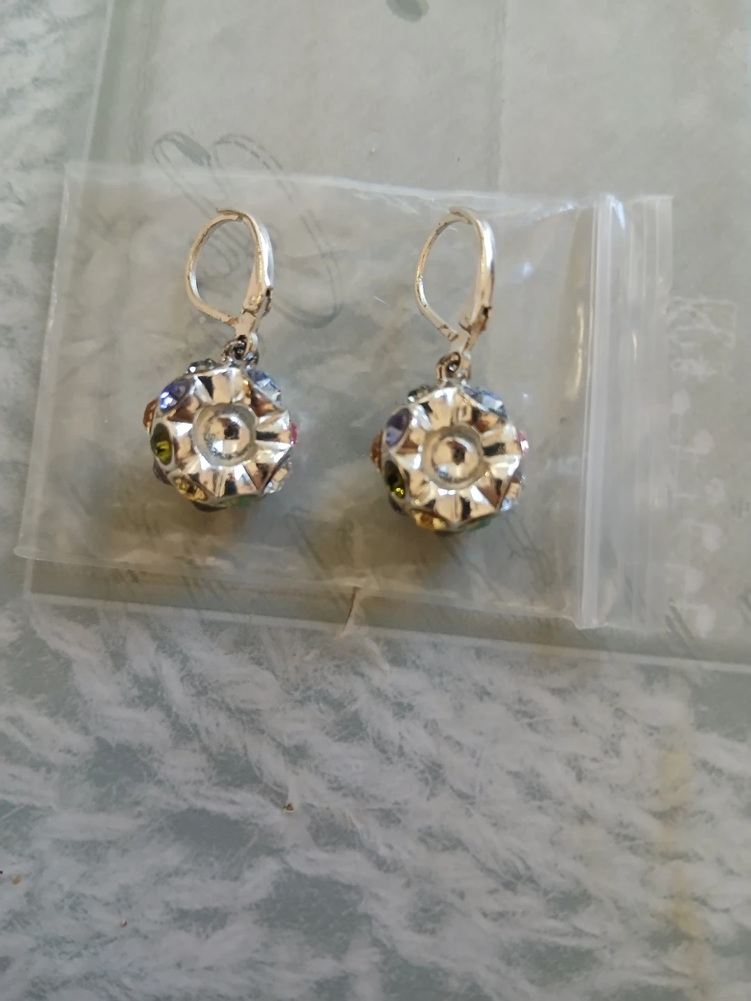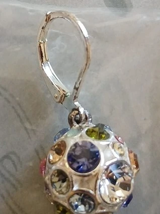 10These are a pair of fun and sparkly drop earrings! They feature a ball design covered in colorful rhinestones that catch the light beautifully. The earrings have a lever-back closure for easy wear. Perfect for adding a touch of glam to any outfit!