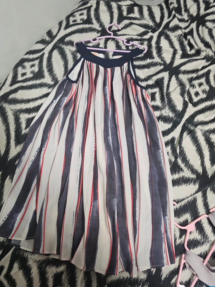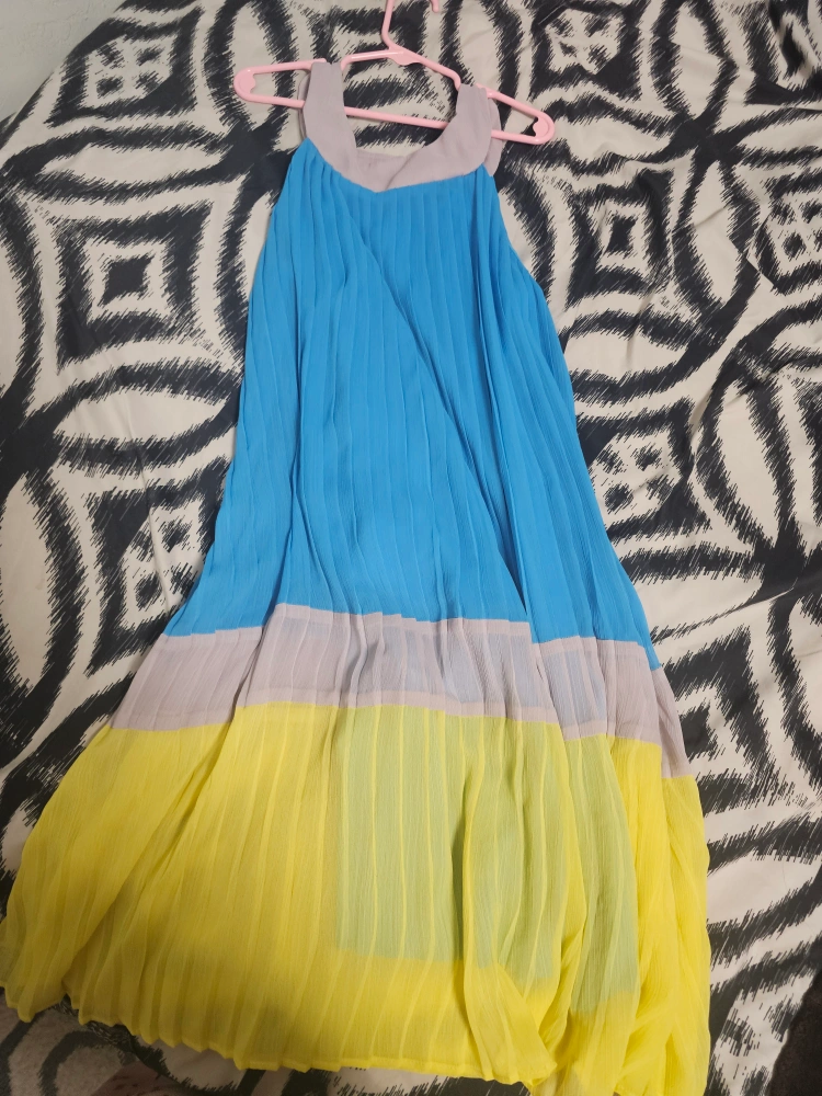 Selling a colorful sleeveless dress. It features a pleated design with blue, gray, and yellow sections. Also including a second dress with a striped pattern in white, gray, and red. Both are in great condition and ready for a new home!