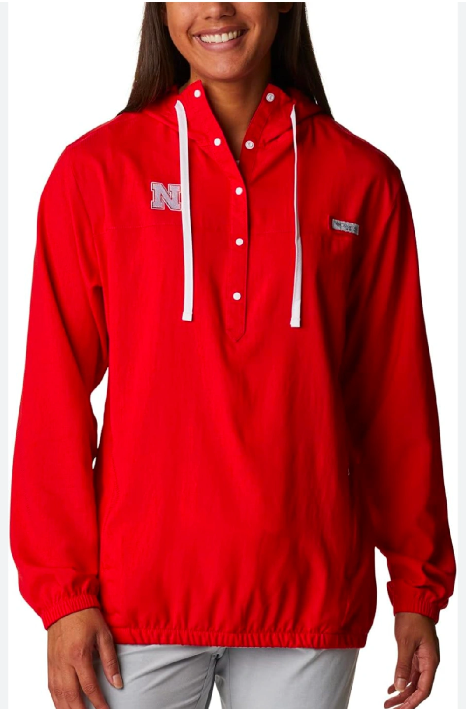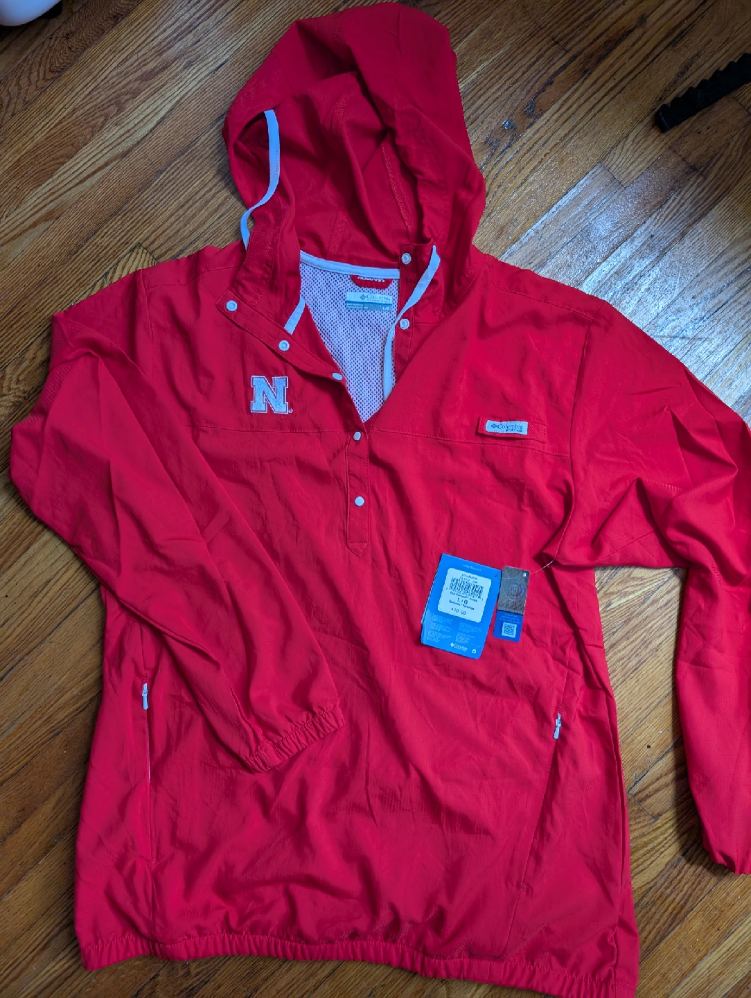 Selling a Columbia CLG Tamiami Hoodie in size L/G. It's a vibrant red color and perfect for showing your team spirit. The hoodie has a sporty design with a button-up front and the Nebraska 'N' logo. Originally $70