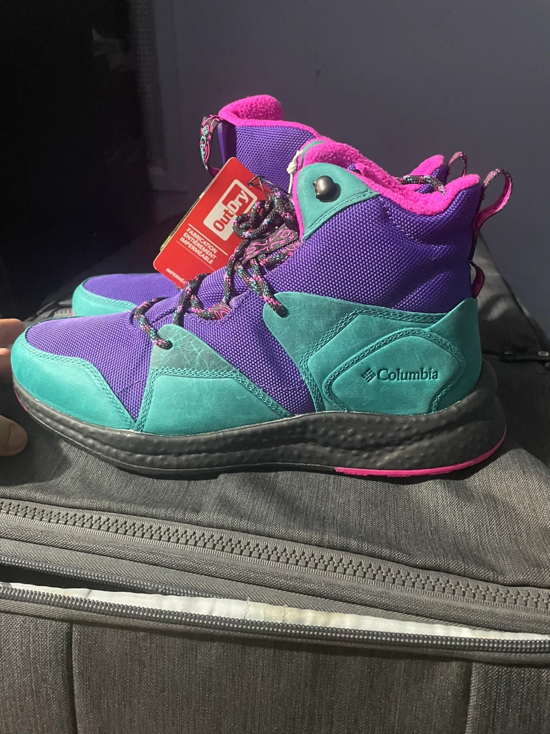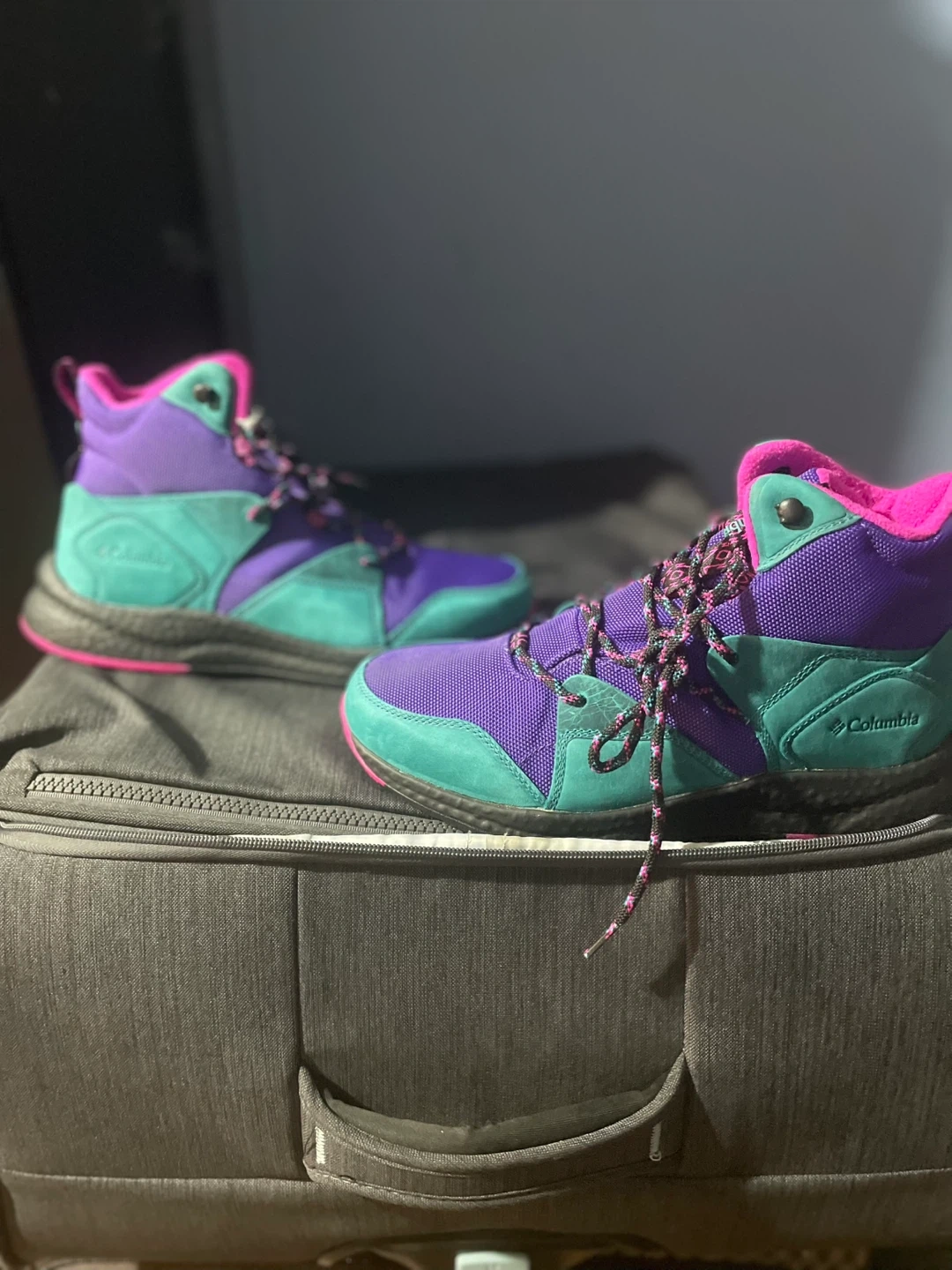 These Columbia hiking boots are in great condition and ready for your next adventure! They feature a vibrant purple and teal color scheme with pink accents. Perfect for hitting the trails in style and comfort