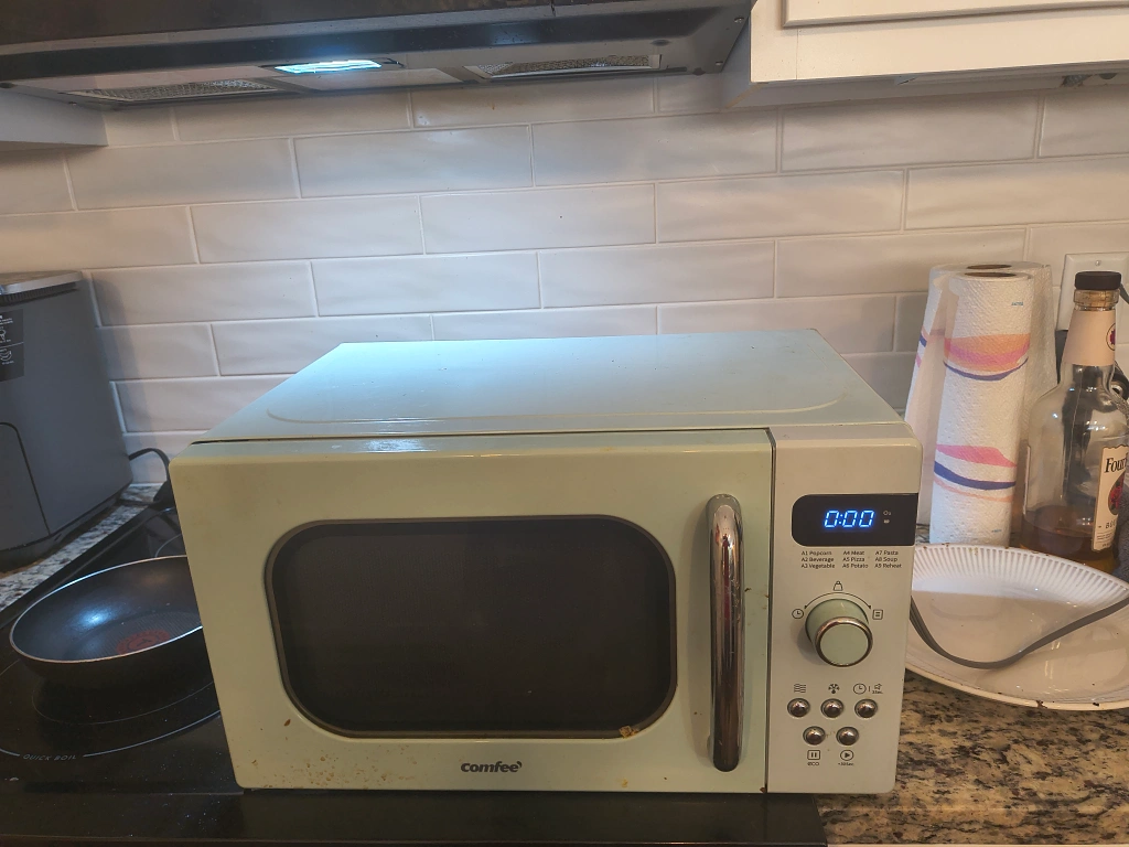 Selling a Comfee' retro countertop microwave. It's in good condition and ready to use! It features a variety of preset cooking options for popcorn, pizza, beverages, and more. A great addition to any kitchen!