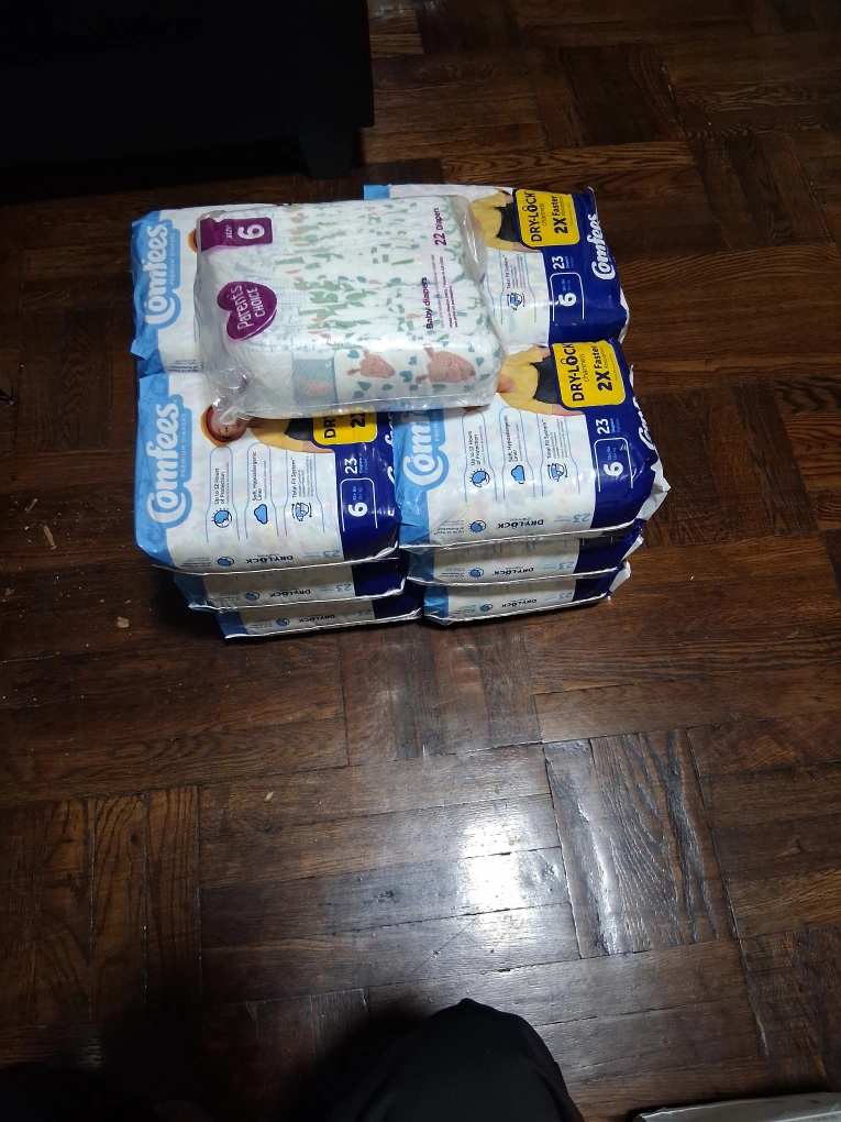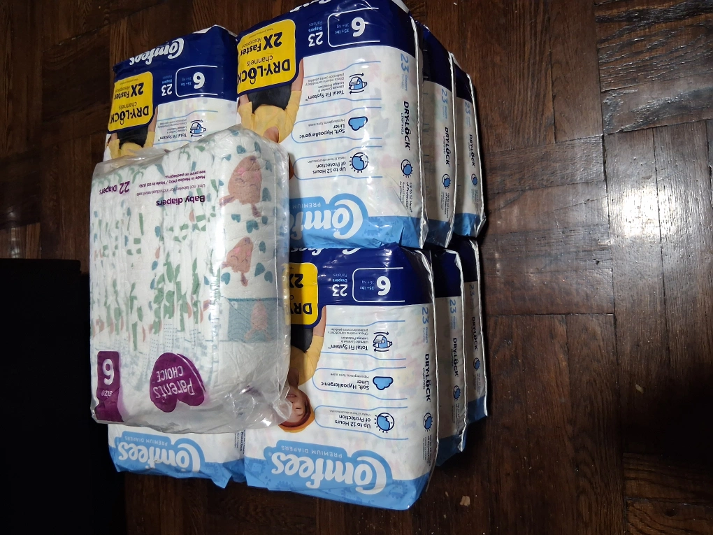 I have 12 packs of Comfees Premium Diapers in size 6. Each pack contains 23 diapers. I also have a pack of Parent's Choice diapers in size 6 with 22 diapers. They feature DRY LOCK for faster absorption and up to 12 hours of protection. Great for your little one! They are each $5. Best Offer.