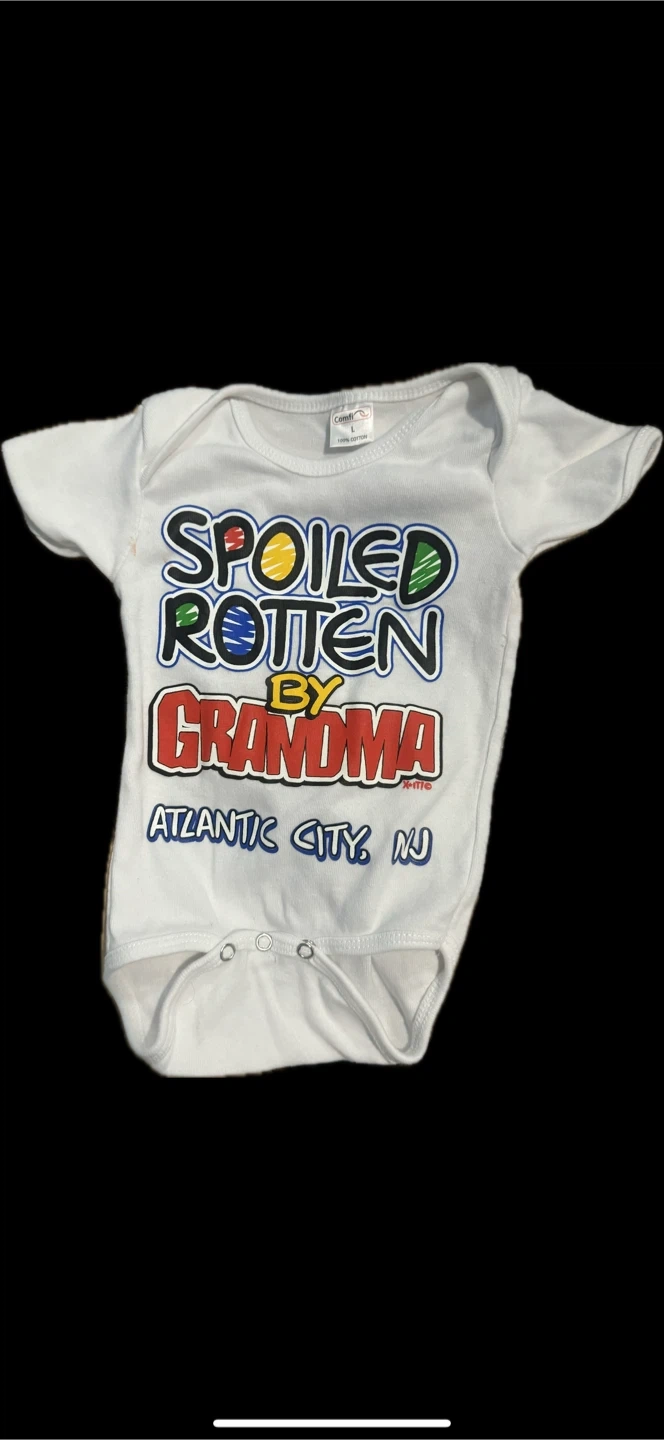 Here's a cute Comfi baby onsie! It's white and says 'Spoiled Rotten by Grandma' in colorful letters. It also says 'Atlantic City, NJ'. Size is L.