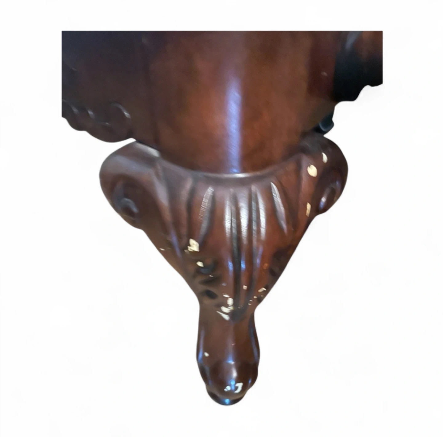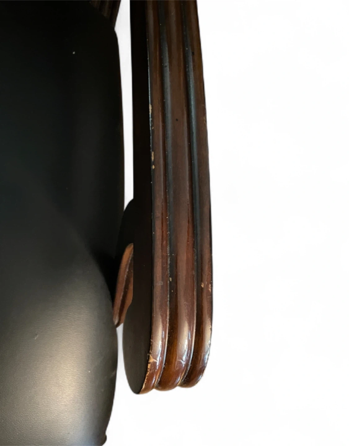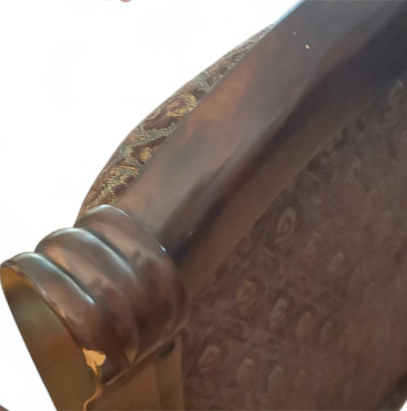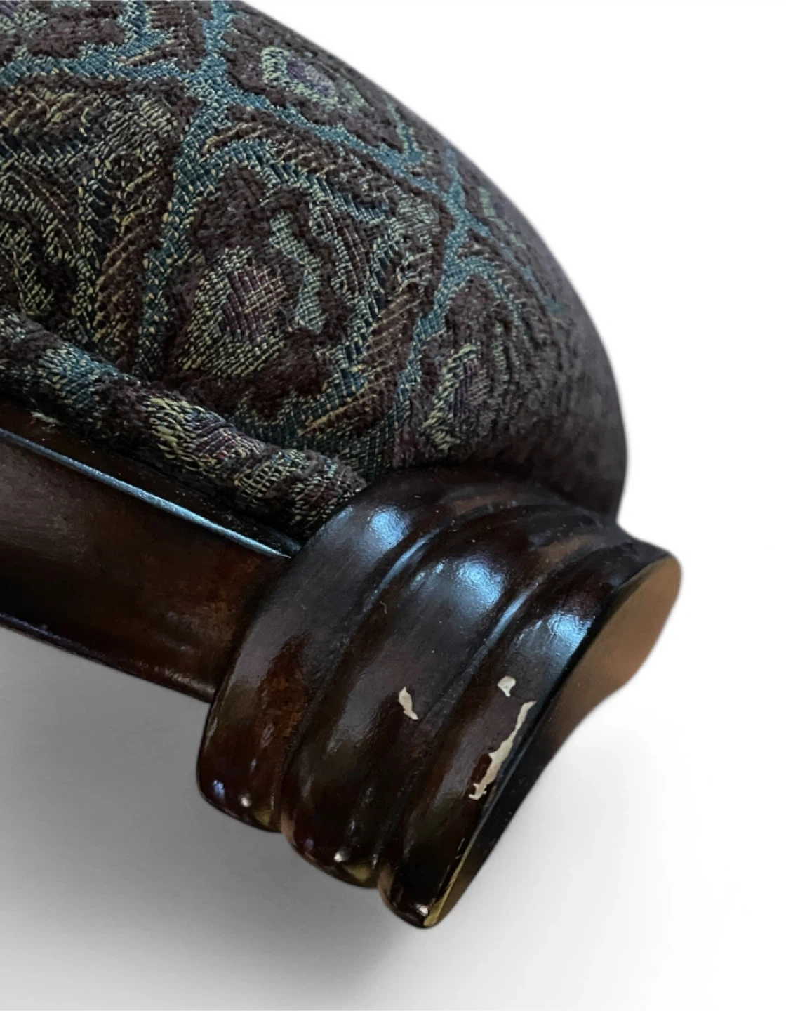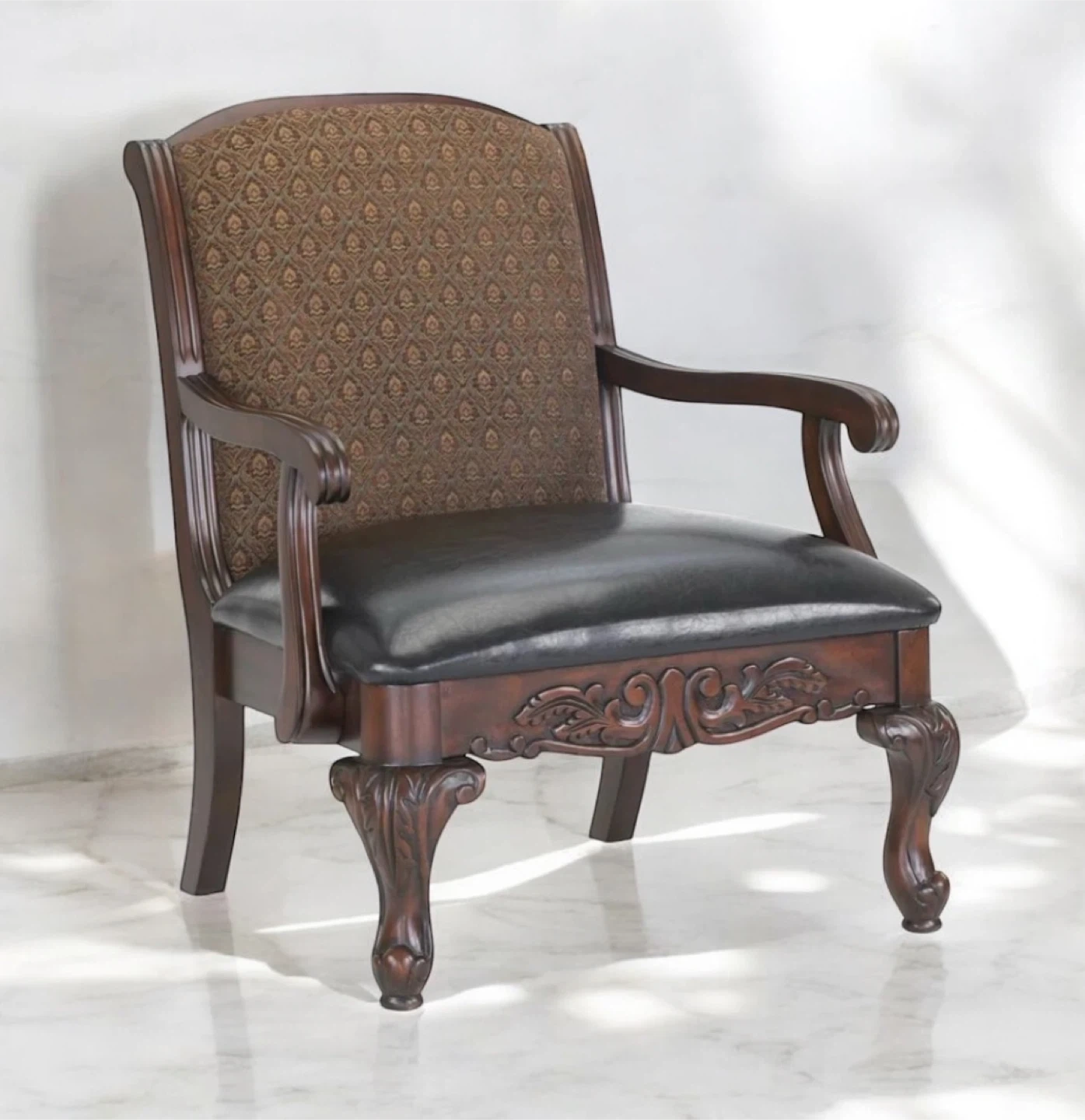Selling a lovely armchair! It features a walnut wooden frame with a patterned fabric on the backrest. The seat is a smooth, dark material. There are some minor signs of wear (paint is chipped)on the wooden frame and legs. Please see pictures for reference. Dimensions: Sitting seat spot: 24.5” D x 26” W Armrest to floor Height: 24.5” Seat Height to floor: 18.5” Brand new is selling in store for $350