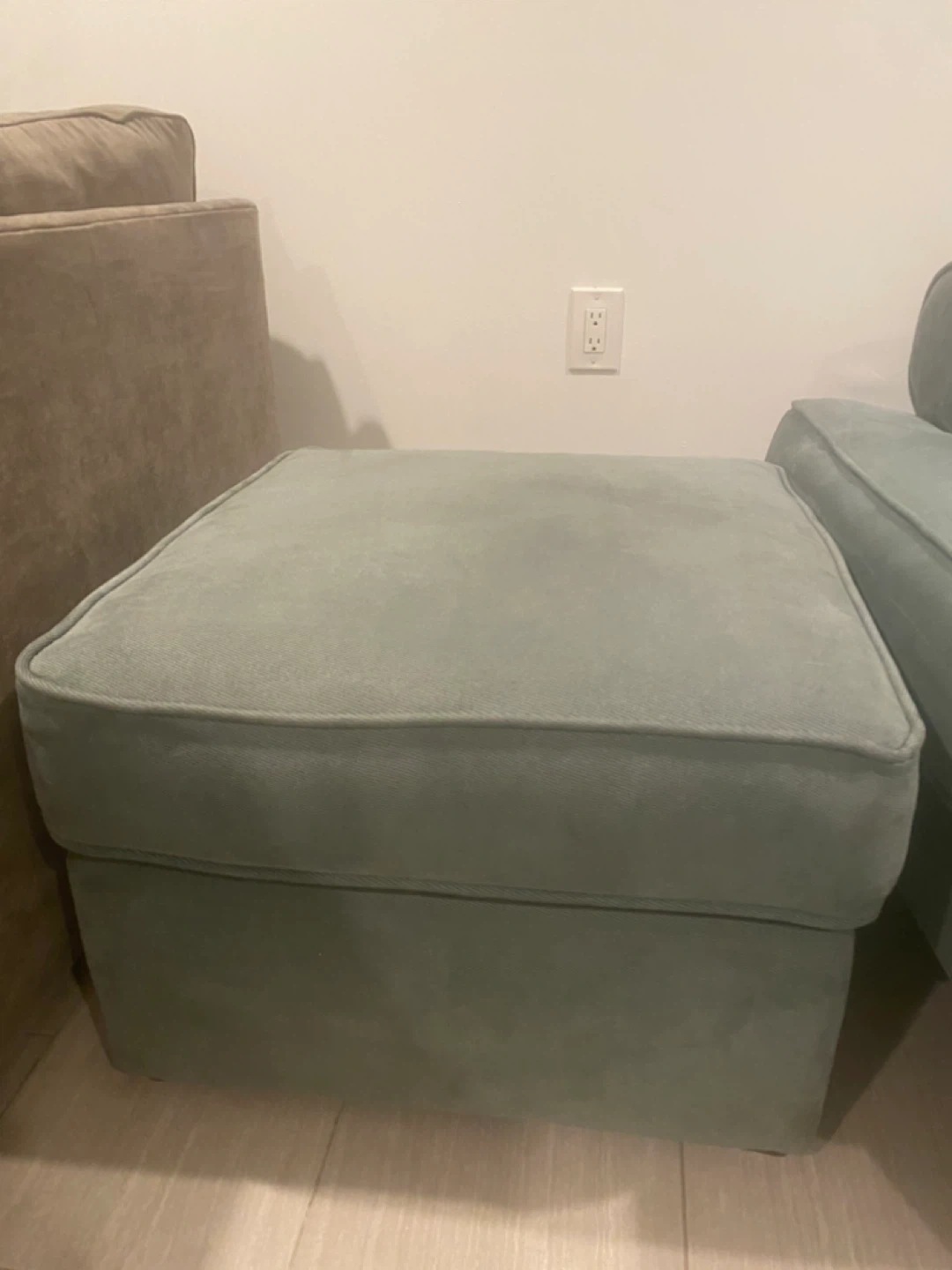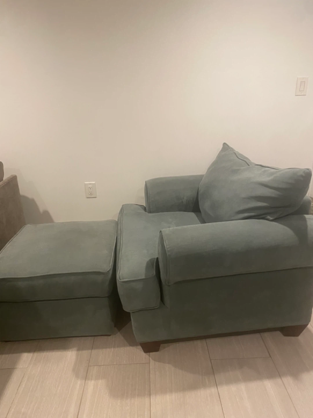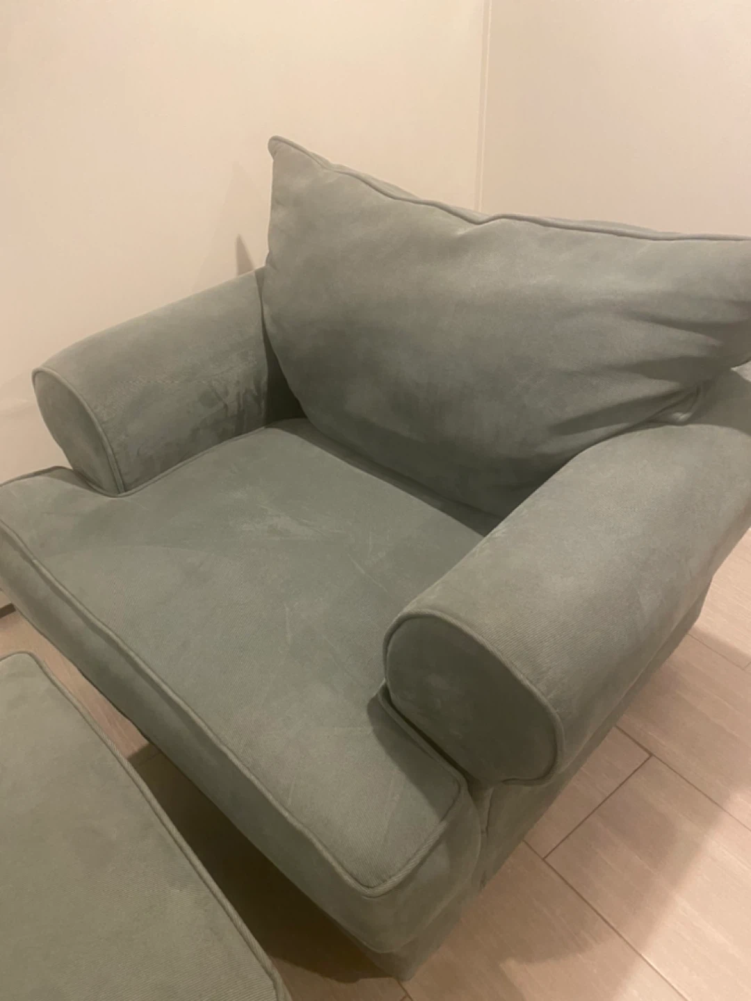 Selling a cozy armchair with a matching ottoman. It's in great condition and perfect for relaxing. The light green color is neutral and would fit well in any room! It's a comfortable set for your living room or bedroom. From Raymour & Flanigan