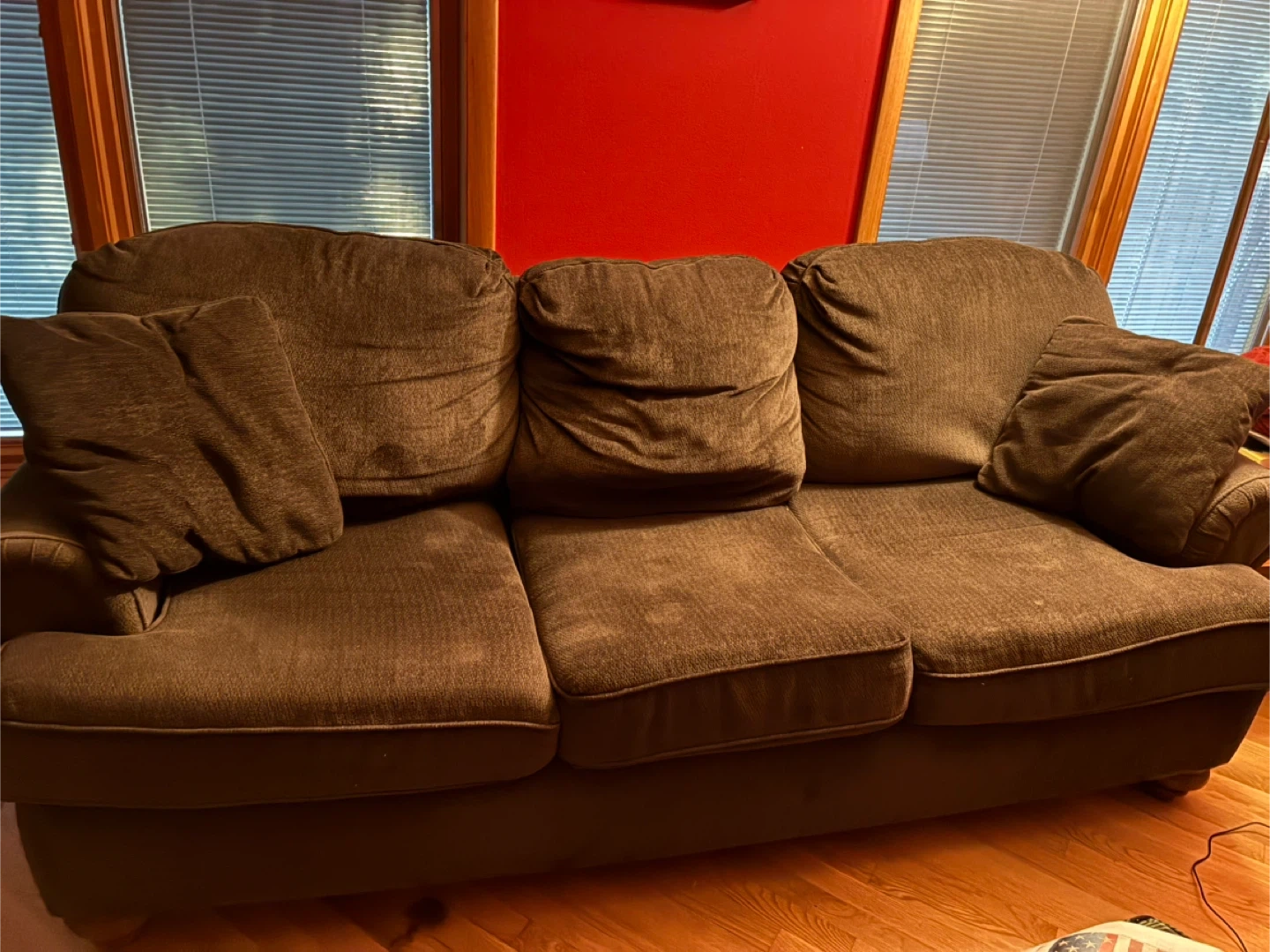 Selling a cozy brown sofa that's perfect for relaxing! It comes with matching pillows to complete the look. This sofa would be a great addition to any living room or den. The Best Home Furnishings sofa in pewter color is a stylish and comfortable addition to any living room. With a traditional design and solid pattern, this sofa can seat up to 3 people and is upholstered in 100% polyester for easy maintenance. Its dimensions of 36 inches in height, 36 inches in length, and 89 inches in width provide ample space for relaxation. This sofa is a great choice for anyone looking for a quality and versatile piece of furniture for their home. Sofa is in excellent condition. It is solid wood framed furniture. Made in the USA not one of the cheap imported sofas that fall apart.
