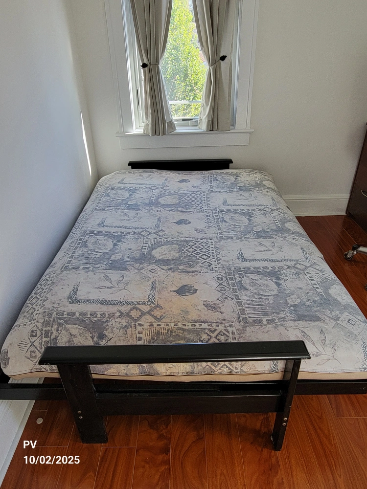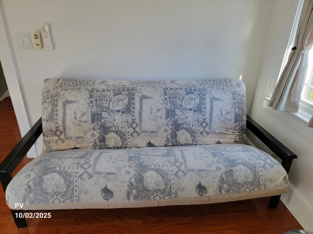 Selling a clean and comfortable futon sofa bed . It has a sturdy black wooden frame and a neutral patterned cushion cover that fits well with any room style. Perfect for a guest room, office, or small apartment โ easily converts from a sofa to a bed. ๐ Condition: Gently used, no stains or damage ๐ Location: Floral Park, NY ๐ฒ Price: $120 (or best offer) Pickup only. Cash only.