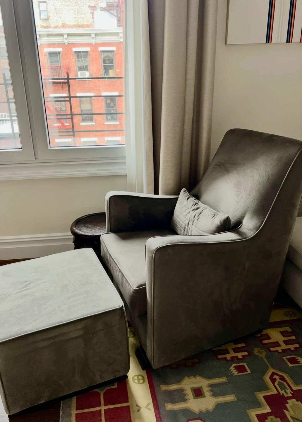 10Selling a comfy glider rocking chair with its matching ottoman. It's in great condition and perfect for relaxing or nursing. The set features a soft, neutral color that fits well with any decor.